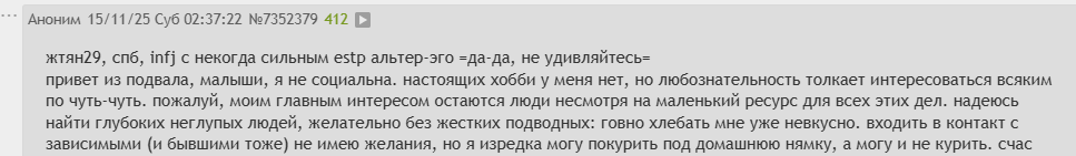 >>215204 Больше всего в духе пикрил (причем, хотя львиная доля достается очередному принцу, приятели-знакомые тоже получают) и всякое прочее "немужик, а вот я". Я привычный, что у БИ-ценностных своеобразный юмор, но это явно не он и не алкоголь. Причем, с ЧС-базовичками так плотно не общался, но мне показалось, что у них, в отличие от, есть какие-то тормоза на такое поведение. Может быть, конечно, это моя ЭСИ такая травмированная. У СЛИ уже пара не с виктимом, там в обе стороны друг друга так хуесосят даже на людях, что я в шоке и они сами от себя в шоке. И все названные персонажи потом жалеют о таком поведении.