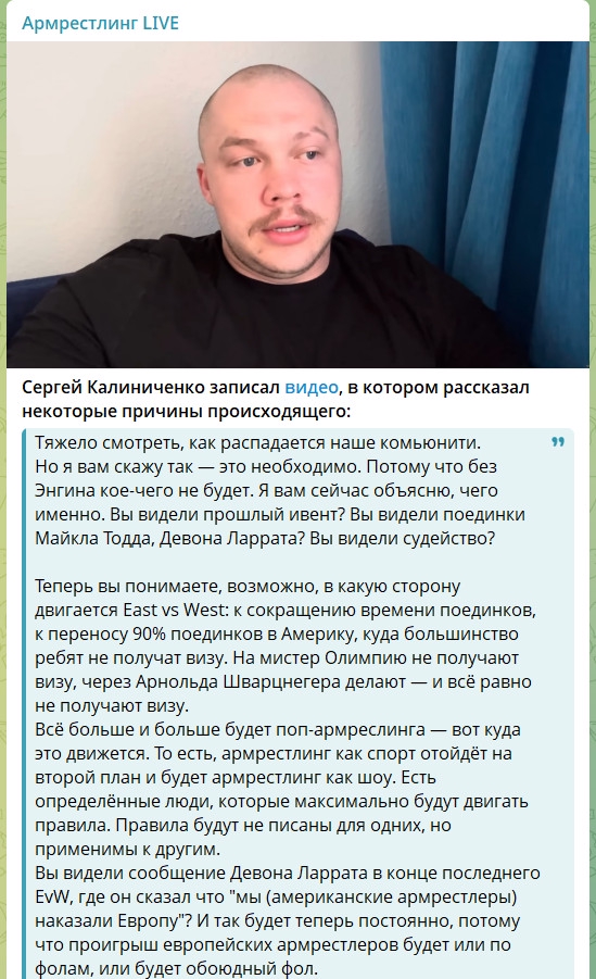 https://t.me/armwrestling_live/408 Ууух бля чё началось. Движуха. Слабачок Девон всё делал так, чтобы поединок с Виталей состоялся на удобной для слабачка Девона территории, пока его жена будет развлекаться с Артемом Тараненко. Только не понял, когда Девон вошел в совет директоров EvW? Или он там с самого начала был?