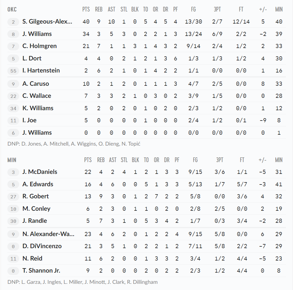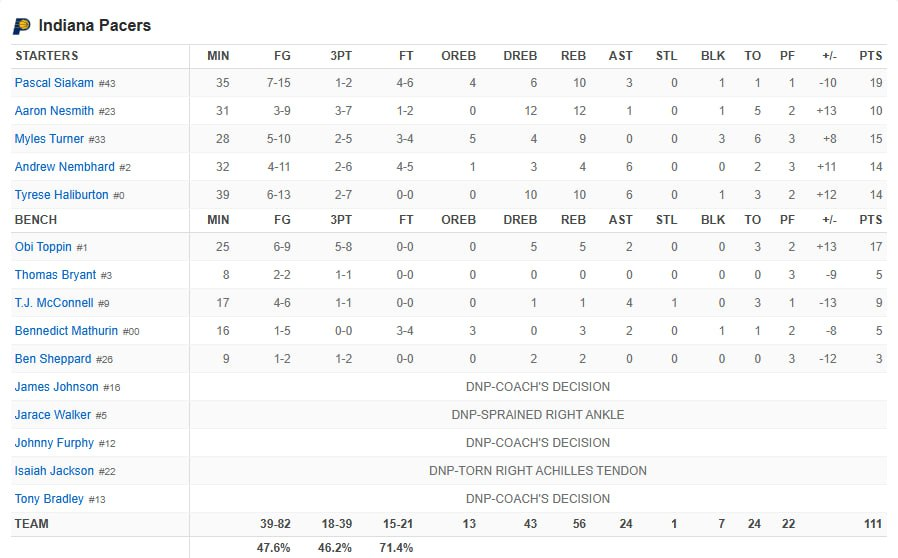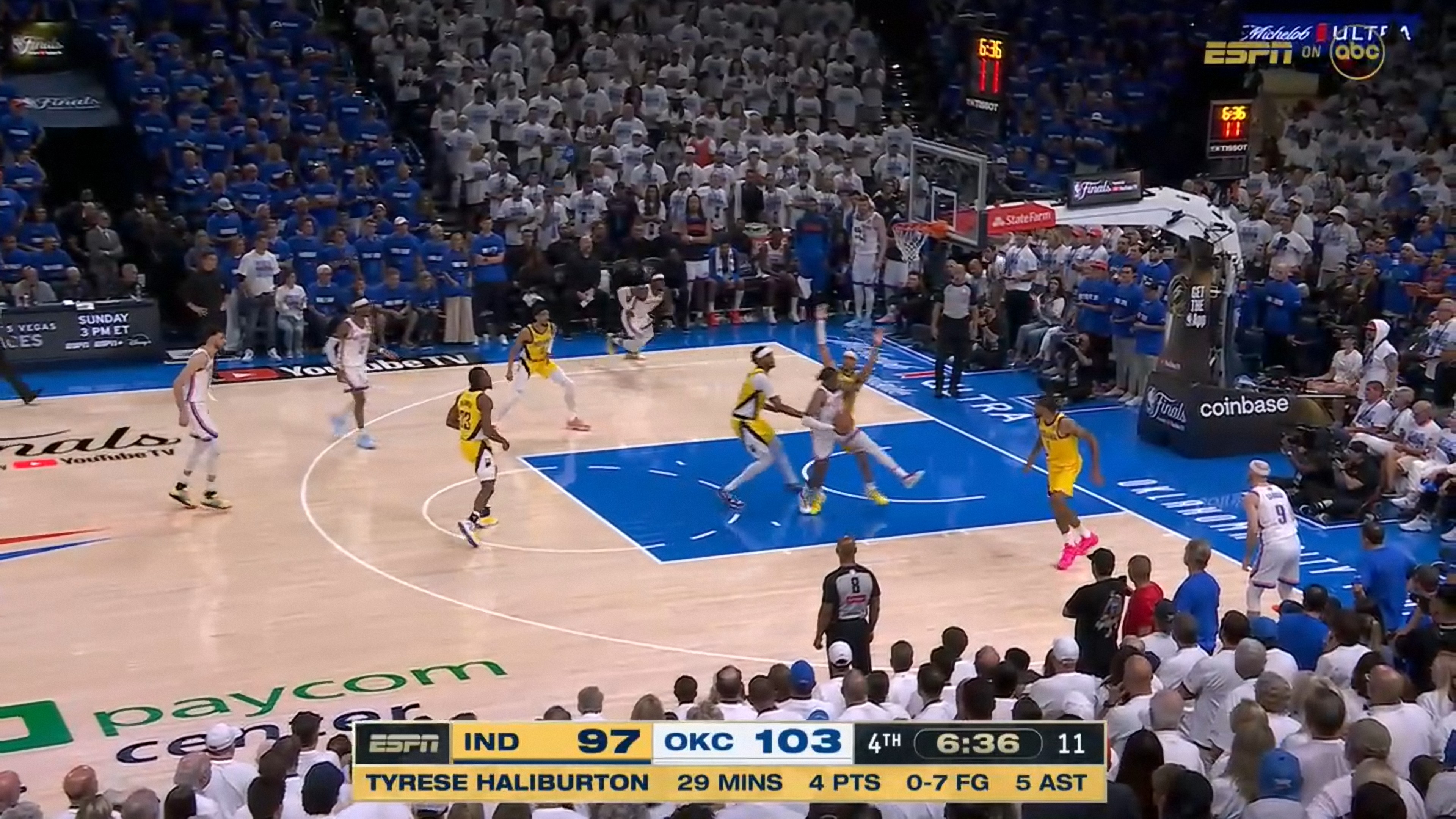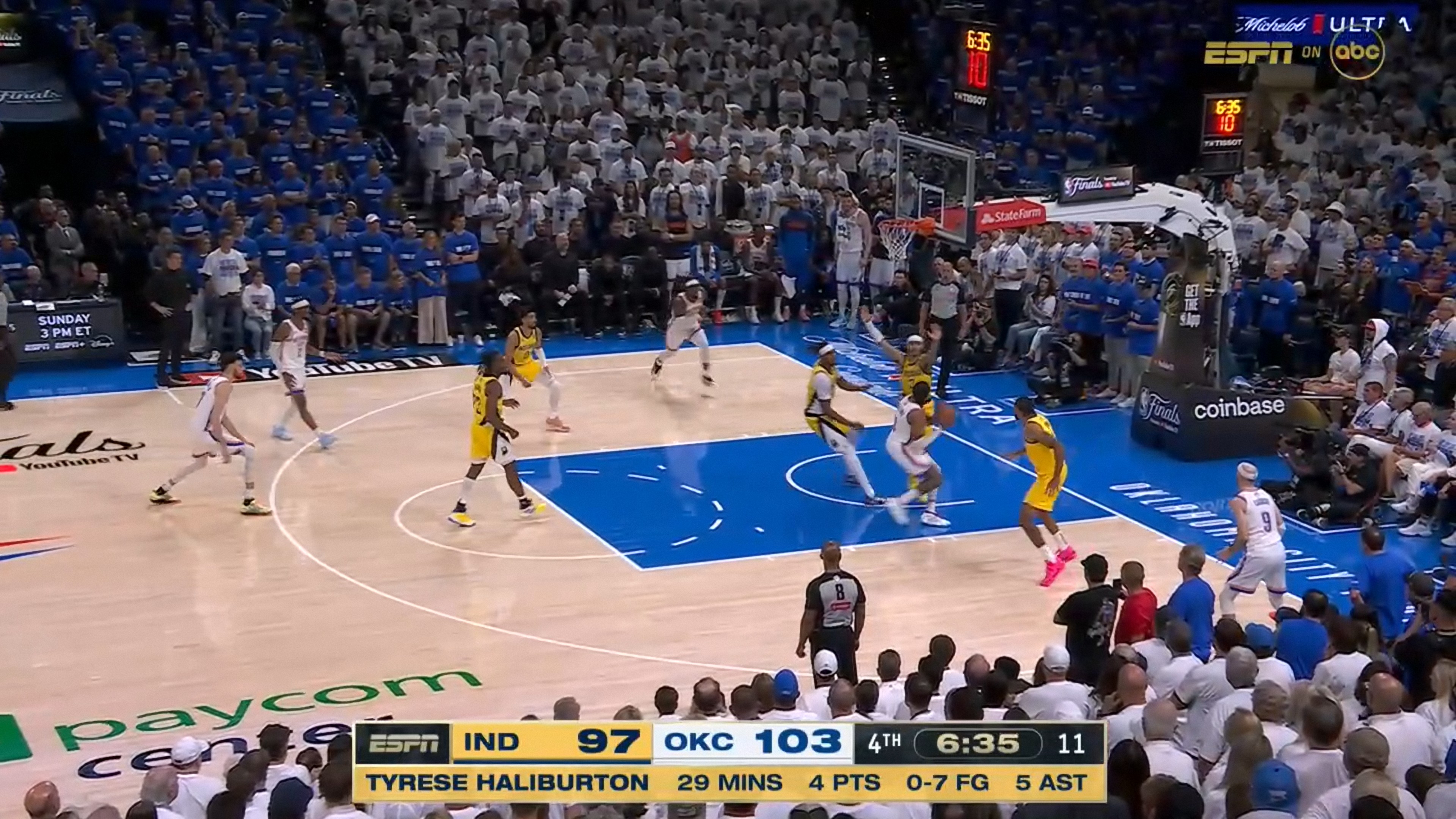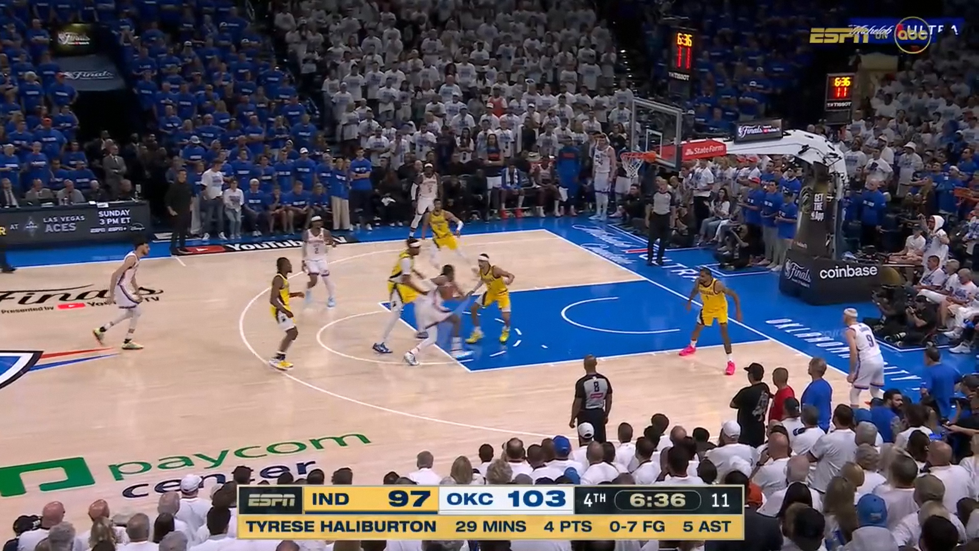 У Индианы отобрали главное оружие - отсутствие потерь. Количество потерь какое-то аномальное, не удивлюсь если это (анти)рекорд в финалах НБА. И такими вводными, с такой очень слабой игрой Халибёртона, когда казалось очевидным что Окла заберет первый матч на своём паркете, Тёрнер, Сиакам и Немхард включаются в нужный момент.