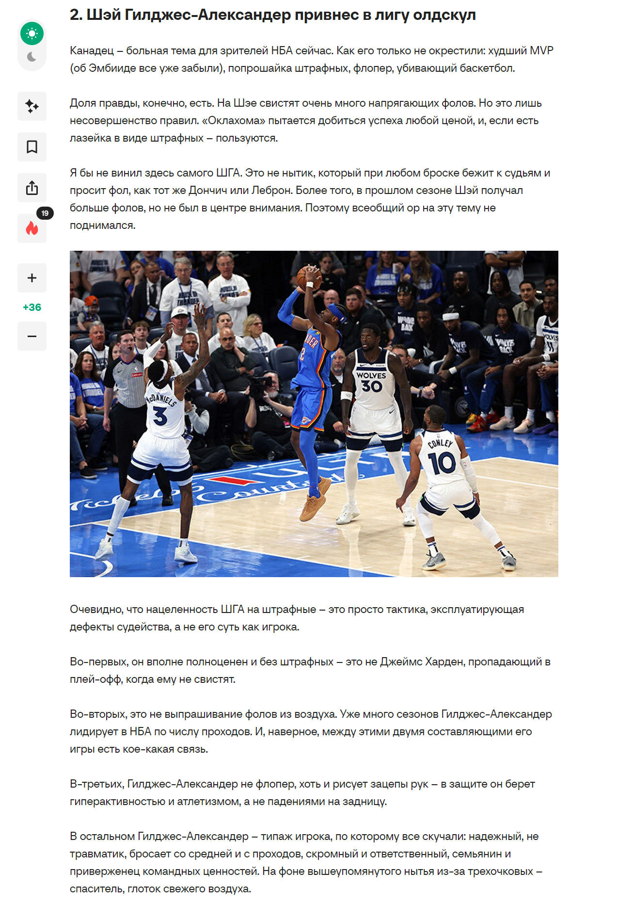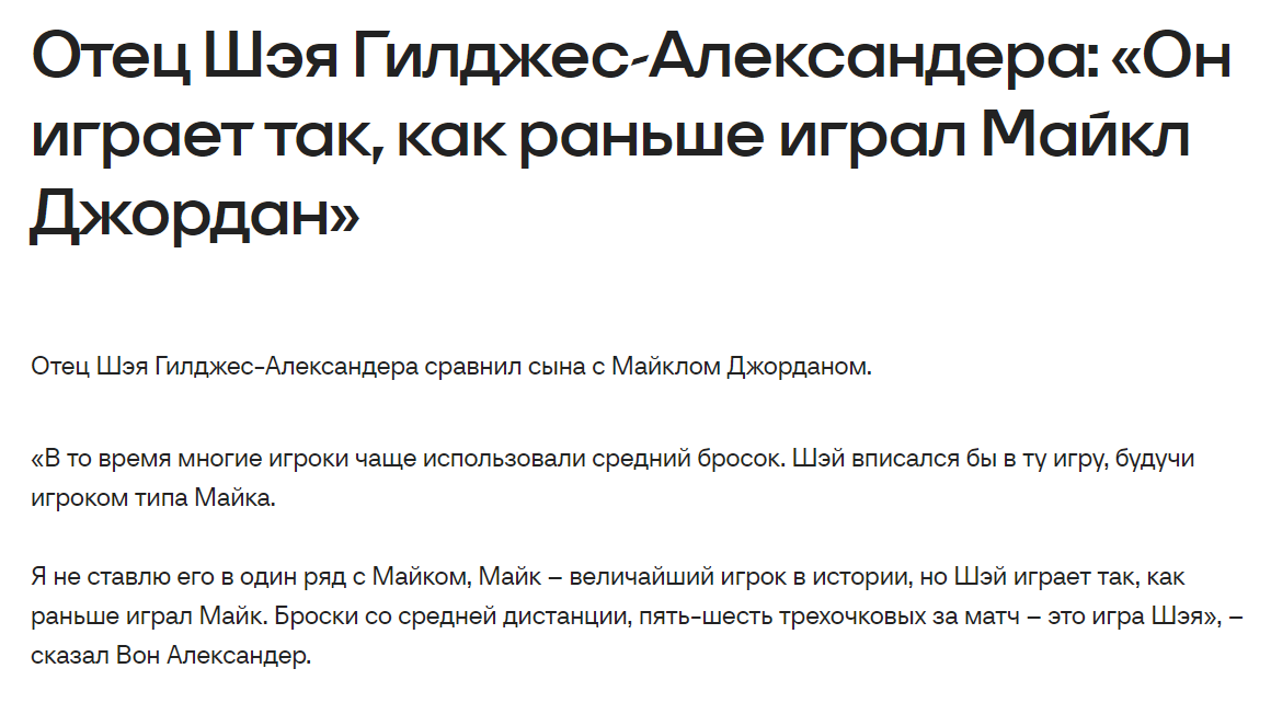 🗣 «В то время многие играли через средние броски. И Шай бы хорошо влился в ту эпоху — был бы игроком похожим на Майка. Не ставлю их на один уровень, но это то, что делал Джордан. И то, что сейчас делает Шай. Думаю, тогда он бы набирал 32-33 очка в среднем».