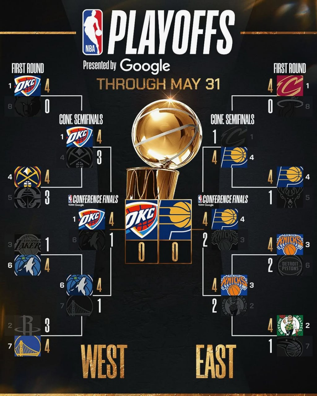 В любых раскладах Династия Оклахомы-Сити Тандер уже чемпион и свипнет любого финалиста от Востока, но мне хочется свипнуть конкретно выскочек и аналгардов из Нью-Йорка. Но буду рад и выходу в финал Инди, их свипнуть будет даже как-то горько, но хоть желчи от меня не будет, зато будет урок для Пэйсерс, как команда из маленького рынка может собрать доминирующую на десятилетие династию. Посмотрим, сделают ли выводы фронт-офис Пэйсерс.