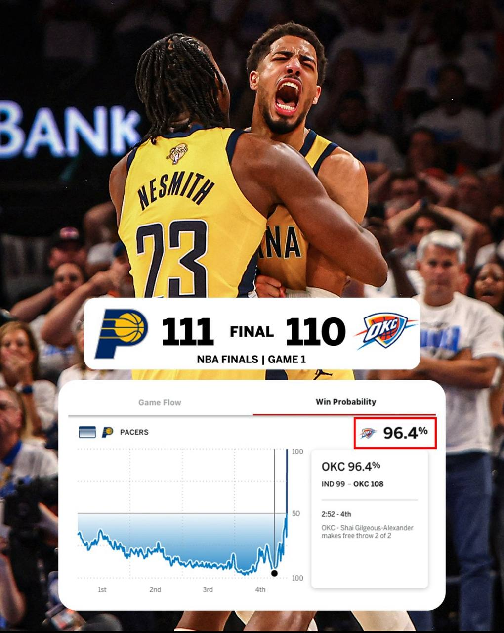 96% на проигрыш. О какой победе Индианы тут вопят глорики-ненавистники Короля Шая? Инди победили незаслуженно, им просто повезло и всё. Дальше им вести не будет. Окла в 5 неизбежно, первый титул из 4-7, Династия строится на наших глазах.
