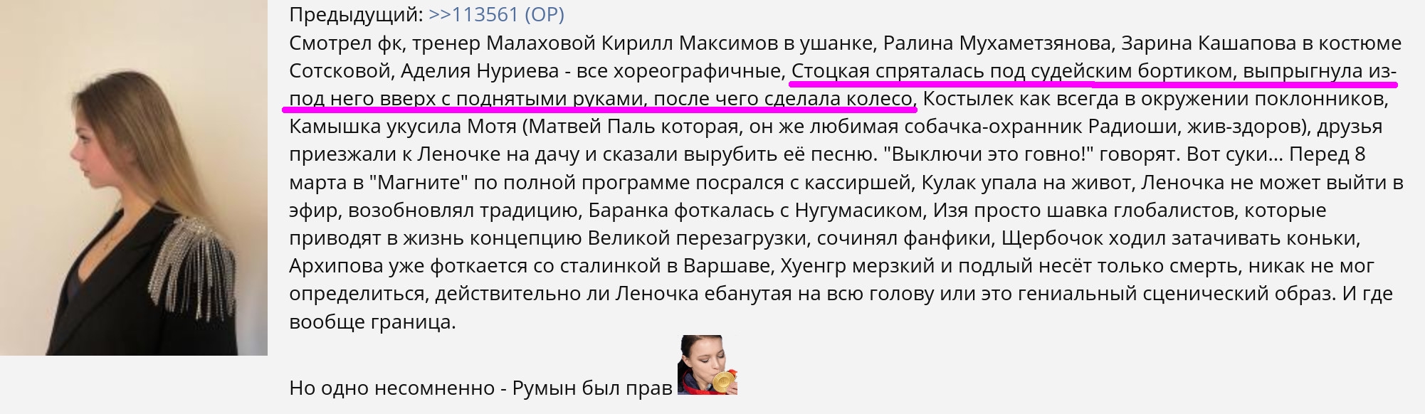>>3231665 Хотела эту историю про "она же ребëнок" Рассказать, если это понадобится в экстренном случае. Но видно, чтоб составить истинное☝ представление о Софии Сарновской рассказываю : В конце сезона, Лена в 8,30 на разминке в зале ОФП в Горках, при Трушкове и Значкове, делая упражнения колесо -дупель, выворачивает руку в локте, в обратную сторону. Кричит от боли бегает, трясëт ей и возвращает еë на место. Это видят все спортсмены нашей группы -13 человек. Лена выходит на лëд с перевязаной рукой. Я прихожу, когда прошло уже пол льда. Смотрю в окно из кафе на тренировку. Ждëм доктора, едем в травмпункт Одинцово. То, что Лена повредила руку на разминке , знала вся наша группа и тренерский состав. Теперь внимание. 👿