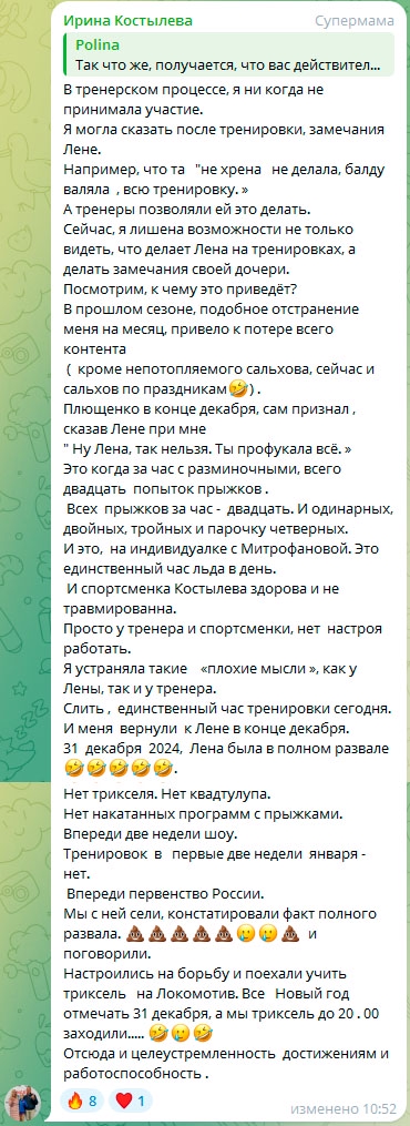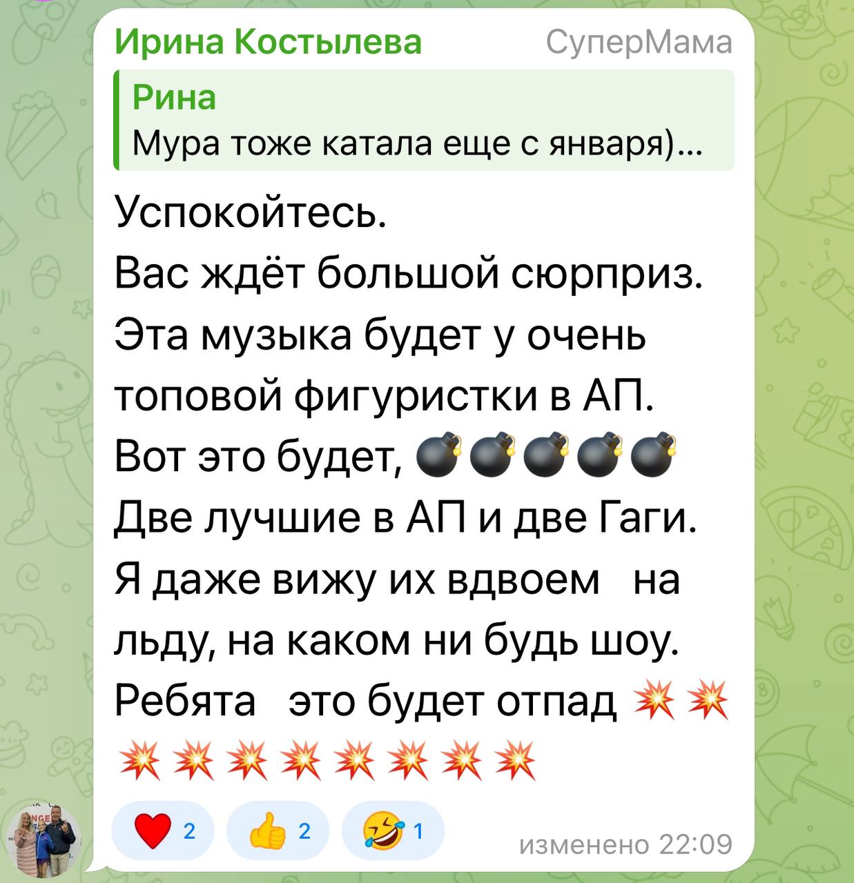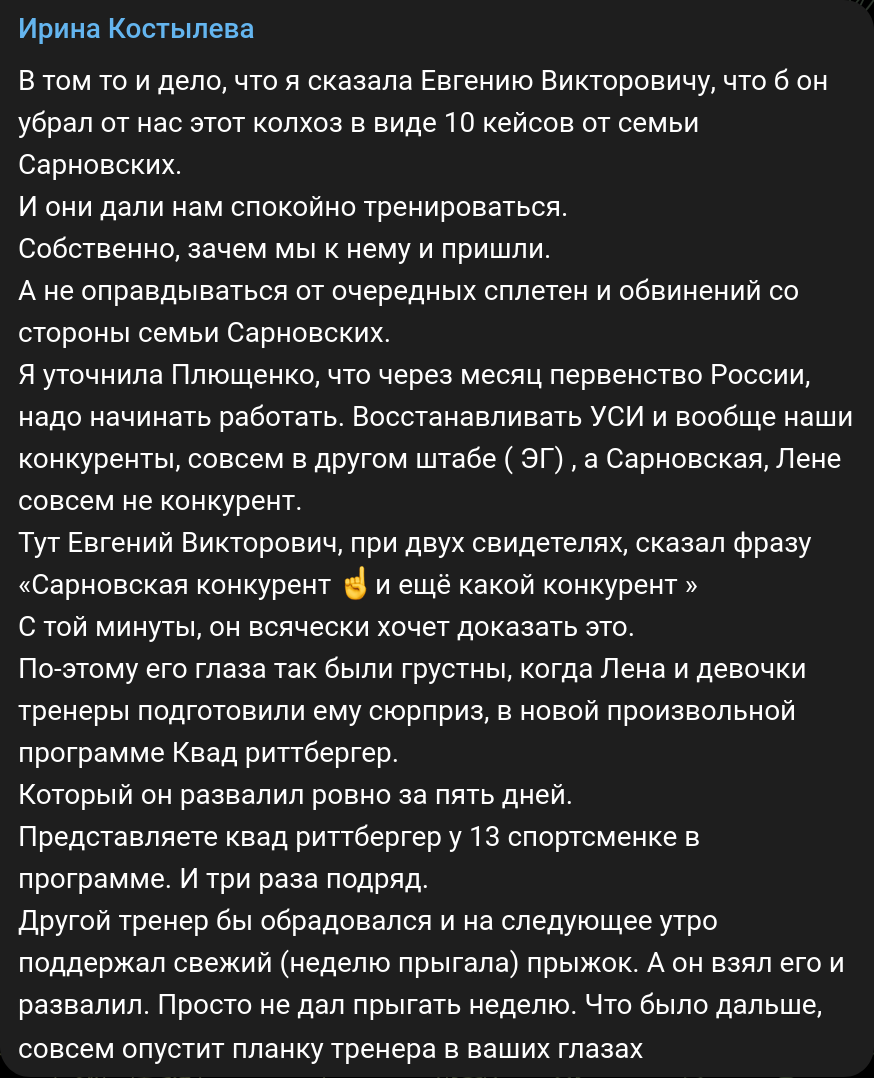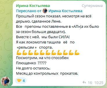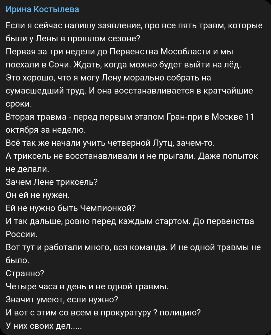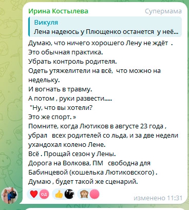 >⚡️Ирина Костылева сообщила, что могильщик-козёл ввёл Лену в рецидив перегрузочной травмы перед контрольными прокатами: