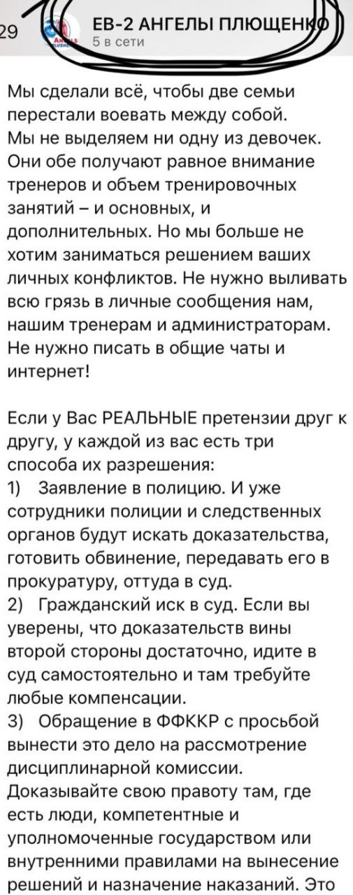 Я обратилась к Яне Александровне с просьбой, наказать спортсменку, за наглую ложь и обвинение меня, в уголовно наказуемом преступлении - избиении ребëнка и нанесении телесных повреждений, с тяжким последствием ( перелом руки). Я попросила у Яны Александровны, чтоб девочка Сарновская, в публичном поле извинилась за обвинения. Ведь клеветала на меня , она прилюдно. Ни лично, ни прилюдно извинений от наглой, бессовестной клеветницы не последовало. Яна Александровна, сказала, что девочка была на меня зла. 😱😱😱😱😱😱😱😱😱