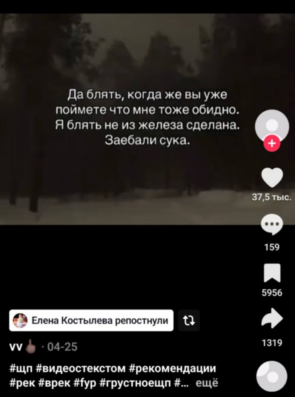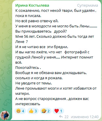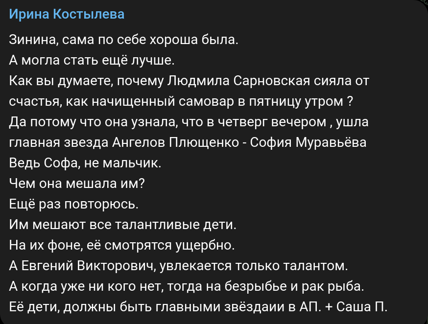 >>3224852 надеюсь, что это дипфейк. Нельзя же такое о дочери говорить публично. Это подстава. Ругаться с Яночкой или Спрутами это норм, рабочий процесс. Но публично ругать дочь это уже дно ... Тёте Ире надо нервишки подлечить.