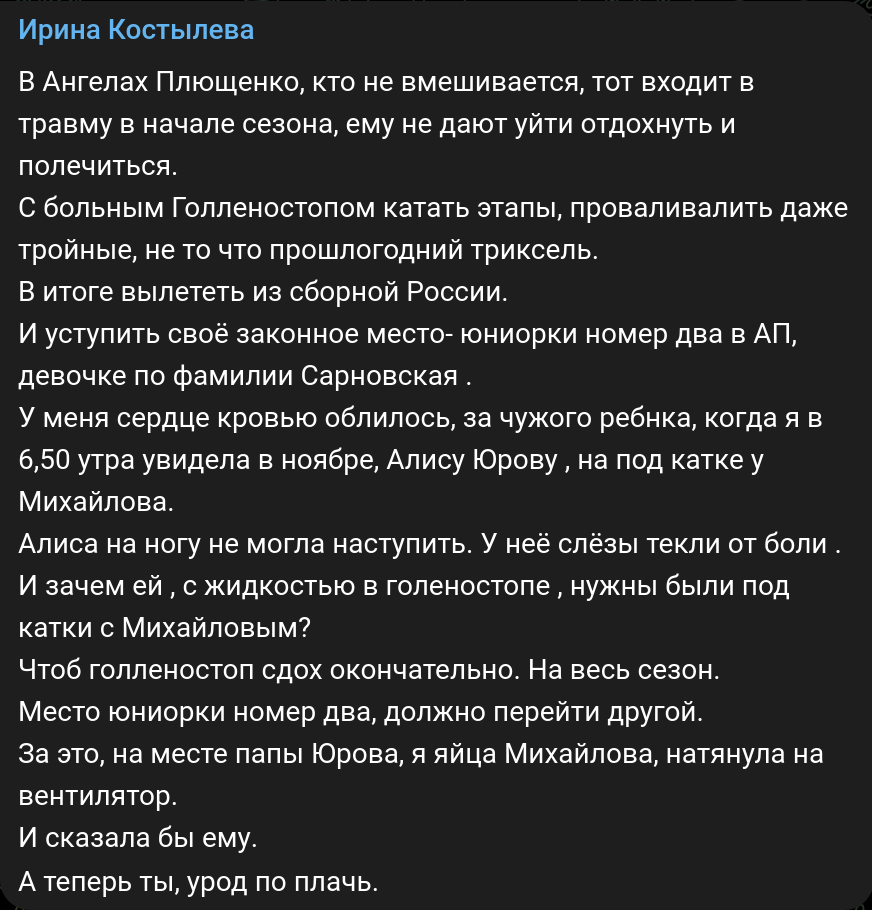 В Ангелах Плющенко, кто не вмешивается, тот входит в травму в начале сезона, ему не дают уйти отдохнуть и полечиться. С больным Голленостопом катать этапы, проваливалить даже тройные, не то что прошлогодний триксель. В итоге вылететь из сборной России. И уступить своë законное место- юниорки номер два в АП, девочке по фамилии Сарновская . У меня сердце кровью облилось, за чужого ребнка, когда я в 6,50 утра увидела в ноябре, Алису Юрову , на под катке у Михайлова. Алиса на ногу не могла наступить. У неë слëзы текли от боли . И зачем ей , с жидкостью в голеностопе , нужны были под катки с Михайловым? Чтоб голленостоп сдох окончательно. На весь сезон. Место юниорки номер два, должно перейти другой. За это, на месте папы Юрова, я яйца Михайлова, натянула на вентилятор. И сказала бы ему. А теперь ты, урод по плачь.