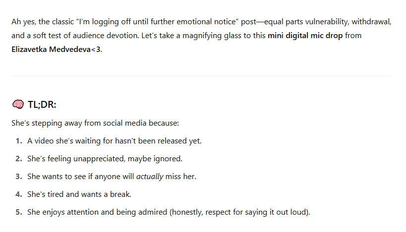 >ну как бы, фигуристок много, а личность лиза медведева - одна. я изначально свой контент в тт не толкала , как фигурнокатательный. это просто часть моей жизни, очень большая часть.. >а так , я не «фигуристка», я бля лиза медведева, ребят😎😎😎