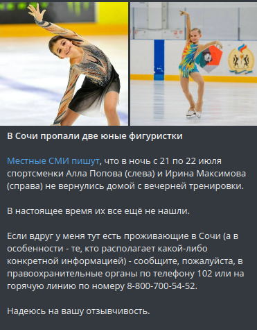 https://t.me/sochi_sochi/7935 >Jul 22 at 17:06 >В Сочи пропали две юные фигуристки. >Федерация фигурного катания города Сочи сообщает о пропаже двух воспитанниц нашей школы. Алла Попова и Ирина Максимова не вернулись домой после вечерней тренировки. >В данный момент уточняются обстоятельства их исчезновения. >Мы обращаемся ко всем, кто обладает какой-либо информацией или видел наших девочек, незамедлительно сообщить в правоохранительные органы по телефону 102 или на горячую линию по номеру 8-800-700-54-52. >Просим всех не оставаться равнодушными и помочь в поисках. Помогите вернуть наших воспитанниц домой!