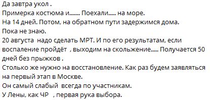 >Изначально травма была получена в апреле при восстановлении квадриттбергера без страховки, в результате постоянных падений на бедро. Вследствие чего Лена не прыгала с 12 мая до 13 июня. >19 июня был получен допуск к тренировкам от травмотологов. Лена успела восстановить триксель, четверные сальхов и тулуп. Далее - перегруз утяжелителями и рецидив. >До сегодняшнего дня Лена только скользила, прыгать было нельзя. Сегодня сделали МРТ – улучшений нет. Значит, и скользить больше нельзя, как минимум месяц.