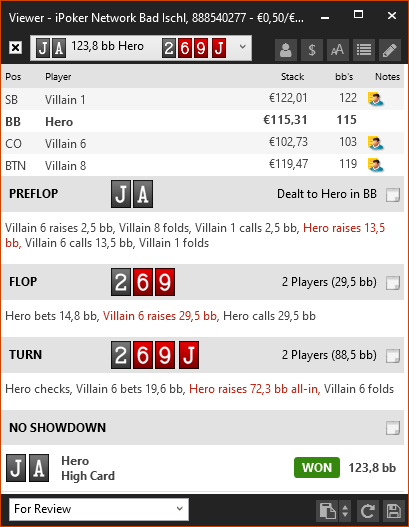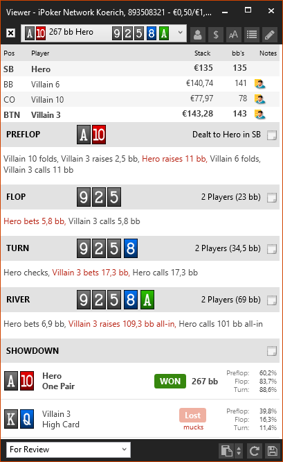 Вот за что я постеров не люблю изолировать, так это то что они за этот 1bb оставленный вне очереди удавятся. Начинают какую-то дичь творить постоянно и сиди гадай, зашёл он с 53o или просто не хочет отдавать свой блайнд. И почему в HM3 не показывается постер в view? Пришлось форумную версию делать...
