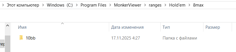 >>3260796 короче если кто будет задаваться таким же вопросом - вам нужно создать в папке монкера следующие папки /ranges/8max/10bb ну и в 8max все что нужно видимо. пока только 10бб загрузил
