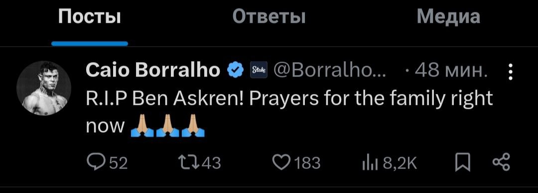 На прошлой неделе стало известно, что 40-летний американский боец был госпитализирован с тяжелой формой пневмонии. Сегодня на странице Борральо в соцсети X появилось следующее сообщение: «Покойся с миром, Бен Аскрен! Молимся за его семью».