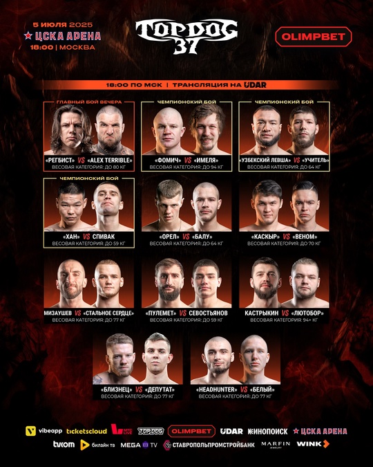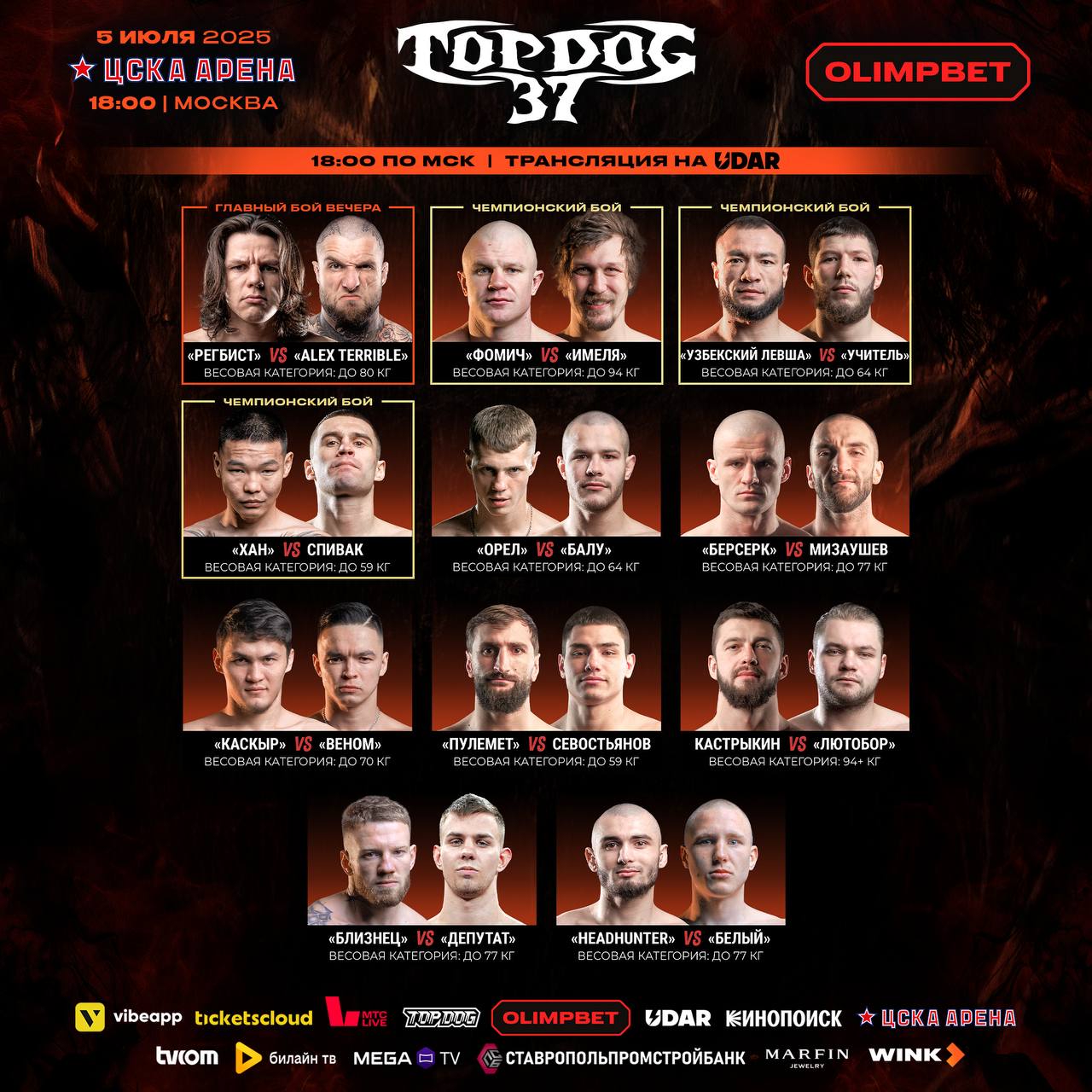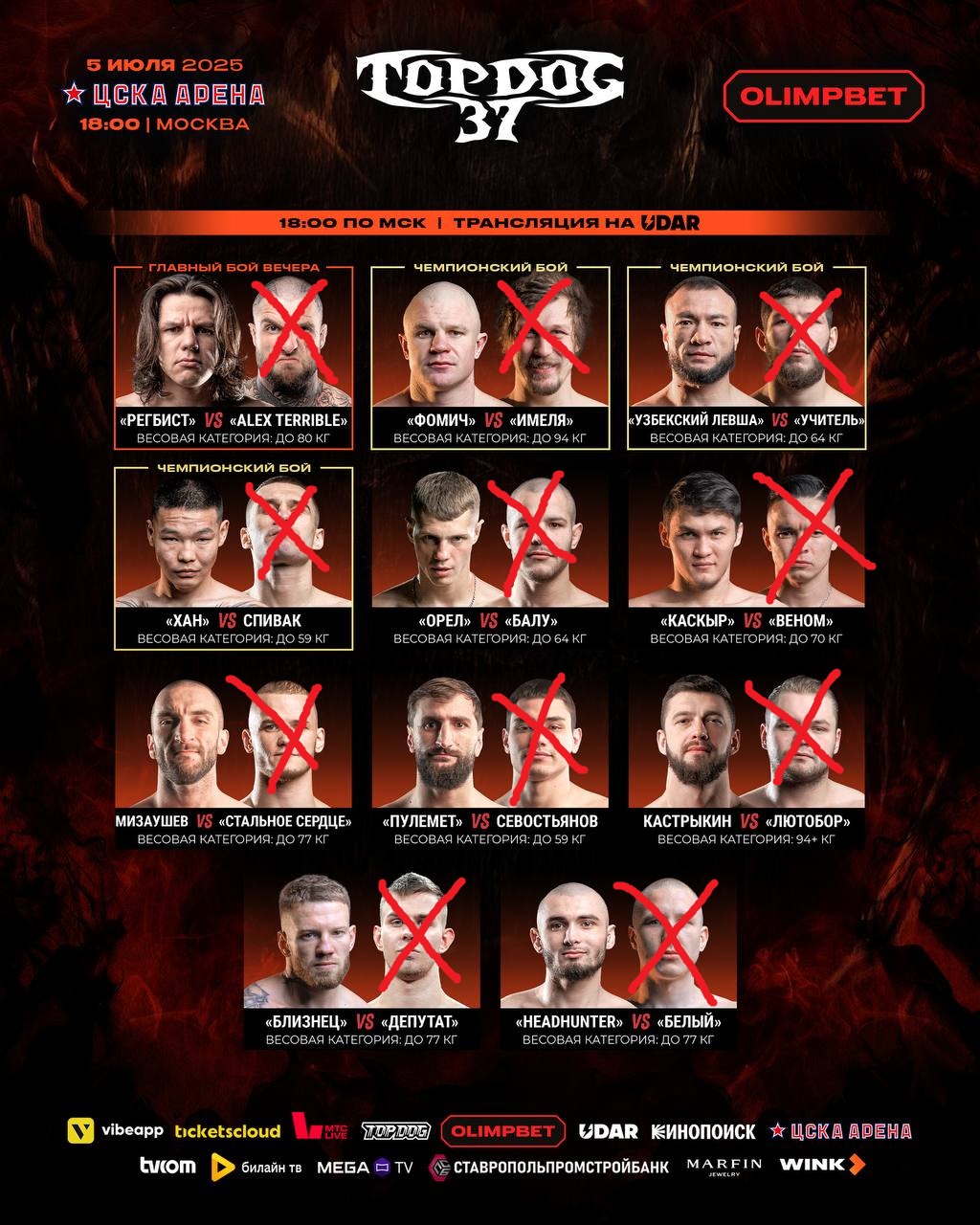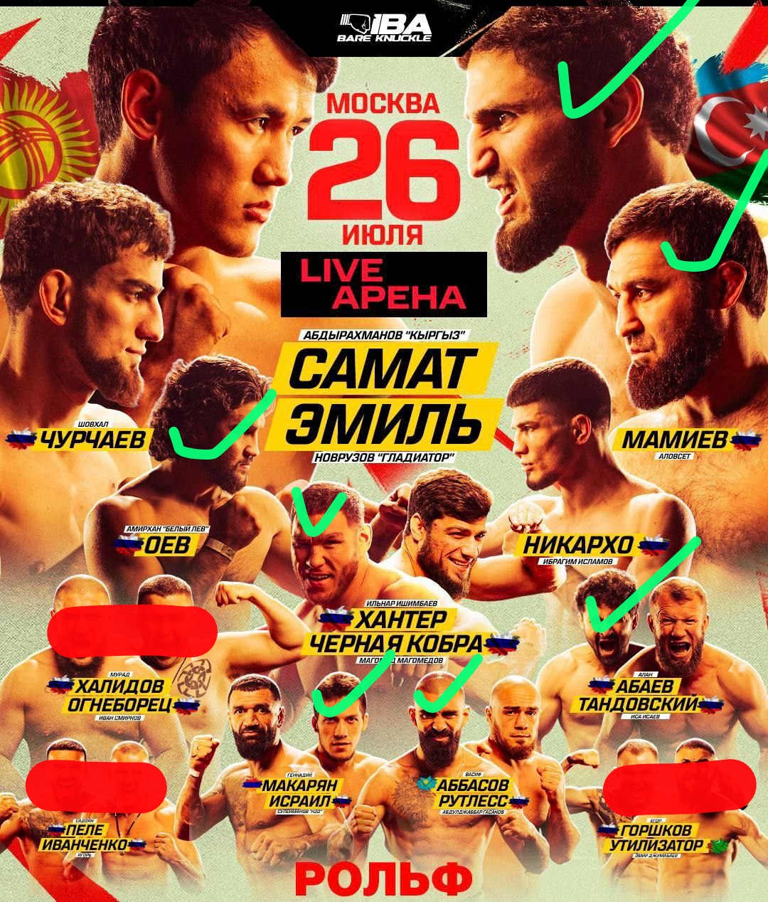 Горшков - Утилизатор. Победа Утилизатора нокаутом. Пеле - Иванченко. Победа Иванченко по очкам. Рутлесс - Аббасов. Победа Аббасова нокаутом. Макарян - Исраил. Чую какую-то странную остановку боя. Но пусть будет победа Макаряна нокаутом. Он побеждал ЗМС Гасанбекова. Абаев - Тандовский. Победа Абаева. Отказ угла или иная остановка. Халидов - Огнеборец. Победа Халидова по очкам. Хантер - Чёрная кобра. Победа Чёрной кобры по очкам. Оев - Никархо. Победа Оева по очкам. Чурчаев - Мамиев. Бой с нарушениями. Победа Чурчаева в спорном бою. Самат - Эмиль. Победа Эмиля по очкам.