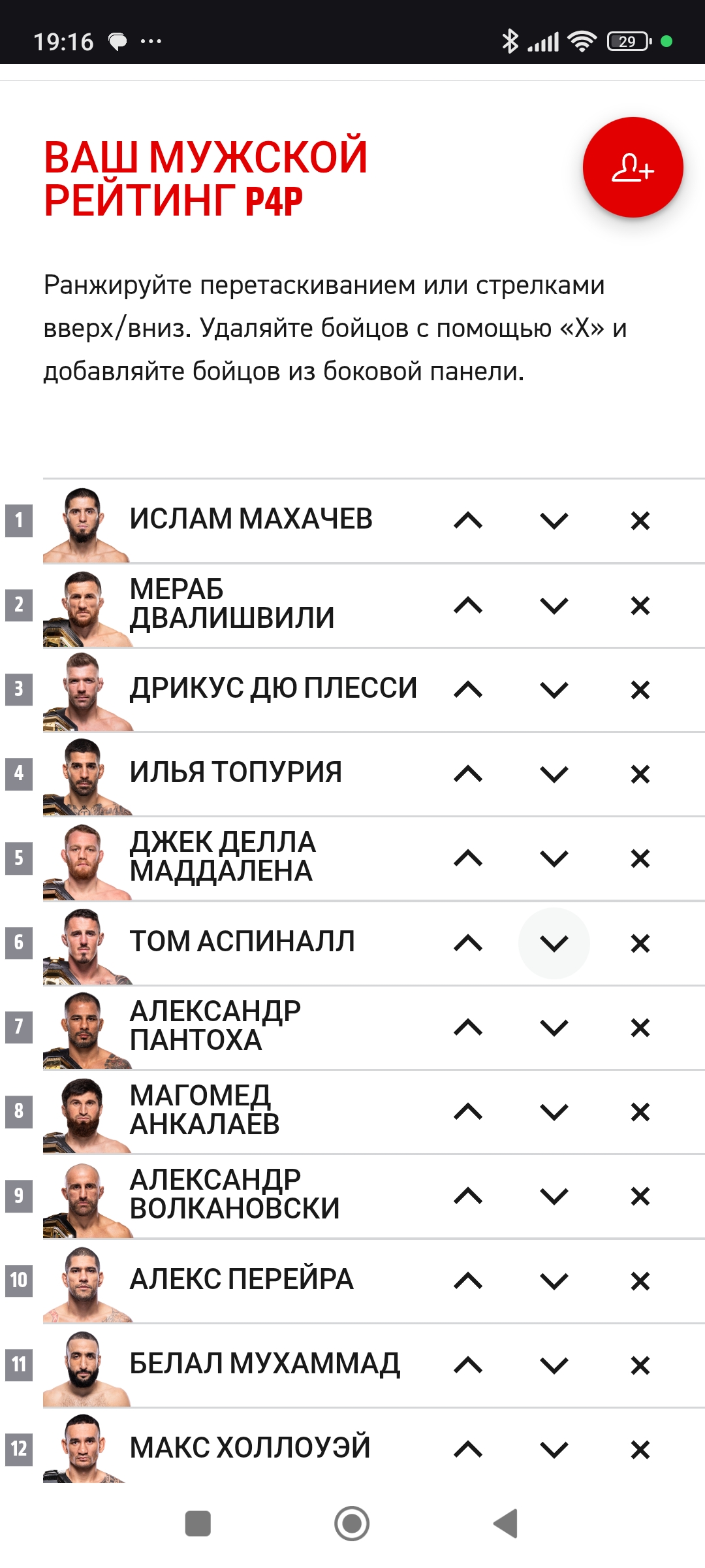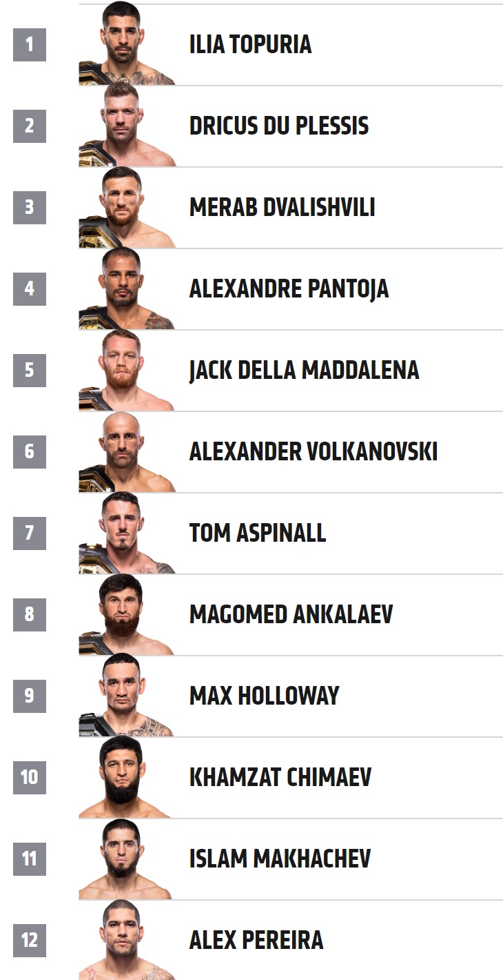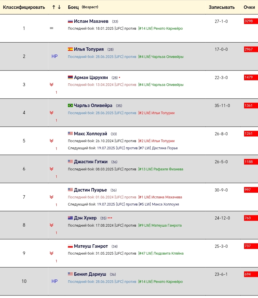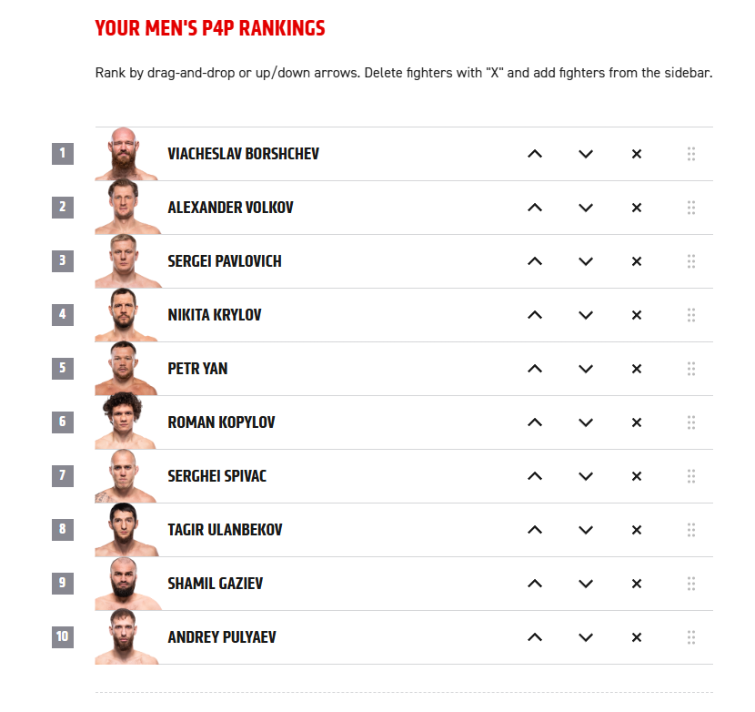 П4п это вообще про доминирование в дивизионе, кто больше доминирует, тот и выше в рейтинге среди других. Грызурии конечно аванс большой выписан. А так всё верно, Макс с шуточным поясом в самом конце, Мага и Том ещё ни одной защиты не оформили и только взяли свои пояса. Волк только вернул пояс, и неизвестно сможет ли защитить, но за былые заслуги его немного повыше. У ДДМ серия + уверенное взятие пояса. Остальные уже гоаты. Гигус, Мераб и Пантожа успешно защищают свои пояса. С чего вдруг они должны быть ниже Калмача, который трусливо сбежал от опасного грызуна? Грызун хотя бы с поясом сейчас, а калмач ещё не ясно, победит ли ДДМ. У грызуна оч много работы, у нему там уже очередь выстроилась. Если когда Сорье победит Макса и заберёт БМФ, он с 300% вероятностью захочет в последний (самый-самый последний) раз потанцевать с грызуном, и тот конечно не откажет. А Калмача, даже если возьмёт пояс, ждут нихуёвые приключения среди молодых и сильных в полусреднем.