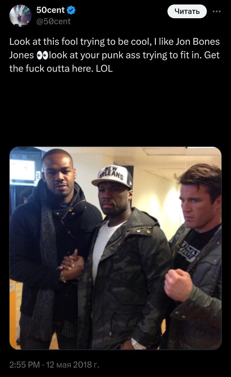 (Фотка в комментах, а текст 50 оказался даже хуже, чем Чейл рассказал, на самом деле было так: 50 cent: "Посмотрите на этого придурка, который притворяется крутым. Мне нравится Джон Величайший. А теперь гляньте на эту шпану, которая пытается примазаться к нам. Пшел нахер отсюда, лол".)