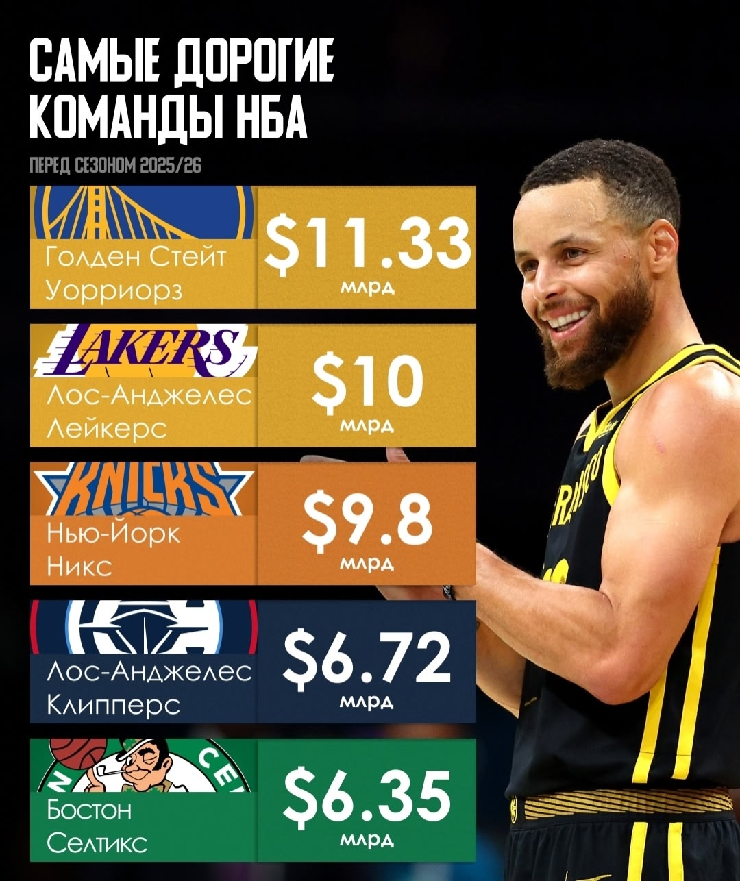 Голден Стейт стали самой дорогой франшизой в пятый раз подряд. Во всем американском спорте это второе место, впереди только Даллас Каубойс из НФЛ с общей оценкой в $12.8 млрд.