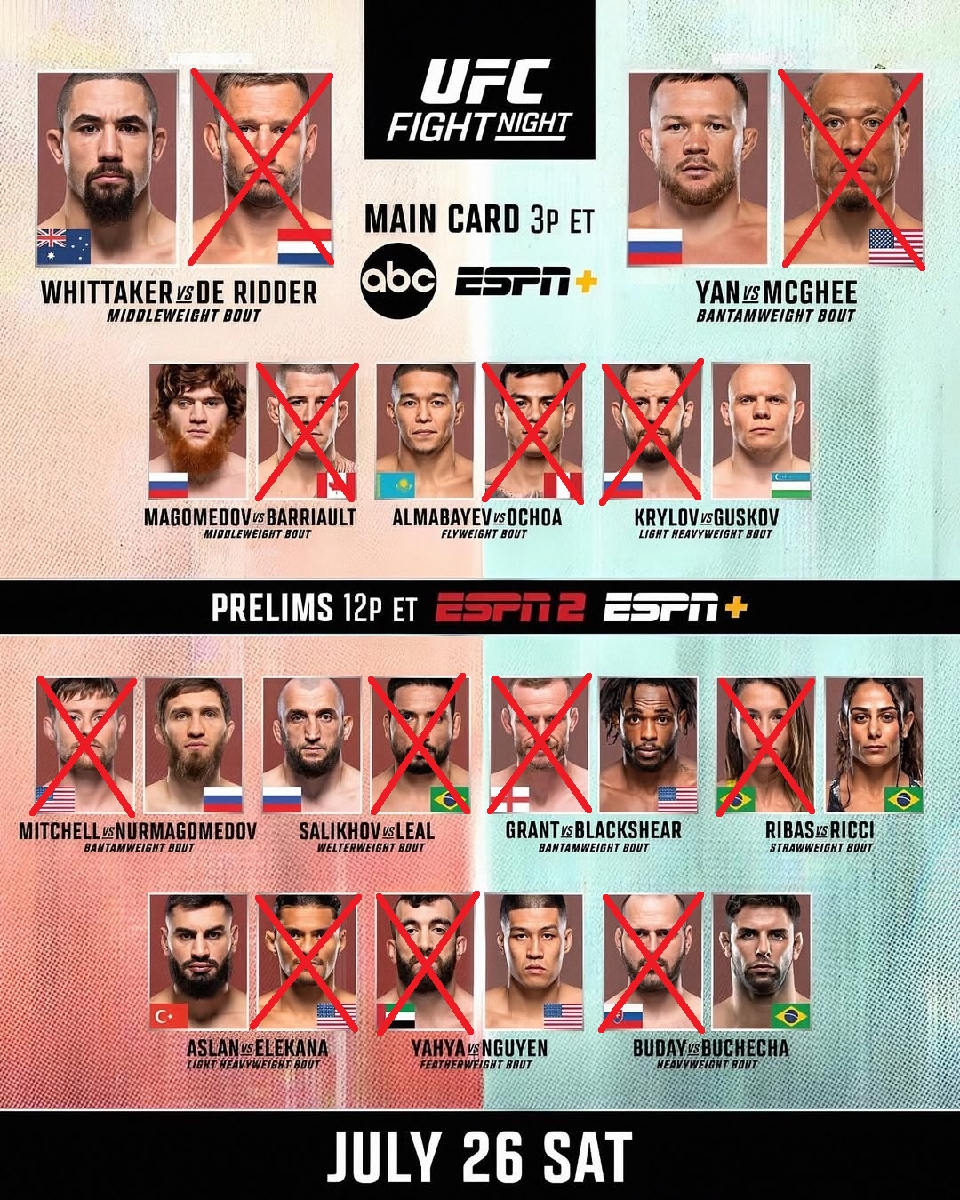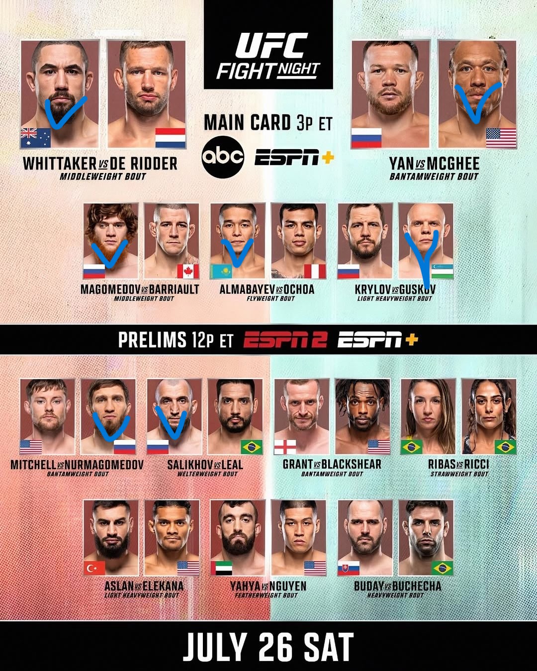 1. Витька досрочно. ДеШиттер меня не убедил. 2. Ян решением или МакГи досрочно. 3. Шаре бомжа дали. Если не пройдет, то можно заканчивать. 4. Казах вроде норм, а кто второй я ваще хз. 5. Крылов какой-то потухший вообще. Богдан хоть и мешок, но в Крылова я не верю. 6. Очень интересный бой. Саид должен забрать, Митчел какой-то шизоид. 7. Чёт я в Леала не верю вообще. 8. Ставлю на негра просто, хз кто это вообще. 9. Женщины аааа 10. Последний раз верю в Ибо. 11. Хз кто это. 12. Бучеча прикольный, Будай мешок.