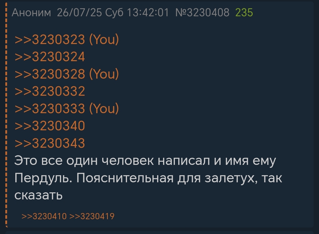 >>3230414 Пердуль, хватит мимикрировать под всех подряд. Ты уже достал всех со своим Волковом. Если ты так восхищаешься своим кумиром - создай тред в фаге, посвященный Волкову, и восхищайся им на здоровье. Хватит засирать тред, Пердуль.