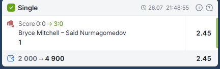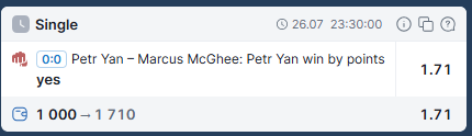1.Я не буду ставить на Рене, несмотря на пик, потому что он не умеет проходить в ноги. Тем не менее я не могу ставить на Бобби, потому что он выходит против бойца больше и сильнее его и мы все знаем как это работает у него. 2.Очень жалею, что поставил на Петяна, он очень стационарный, в кабину может сильно залететь. Ещё вопросы ?