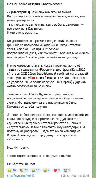 Сезон 2024-2025 "Я подумала , глядя из кафе на лëд числа 4-5 октября: На хуя за неделю, до первого этапа Гран-при - 11 октября учить четверной Лутц Лене? Всë межсезонье, даже подводящих не давал. А тут аж сам на лëд вышел. На тренера -дурака , вроде не похож. Точно хочет в травму вогнать. Это самый худший, в моральном смысле год. Год, сплошных восстановлений контента с нуля. Пять травм и два восстановления по болезни. Семь раз с нуля, буквально максимум неделя до старта, который ещё она и выигрывала у лучших. "