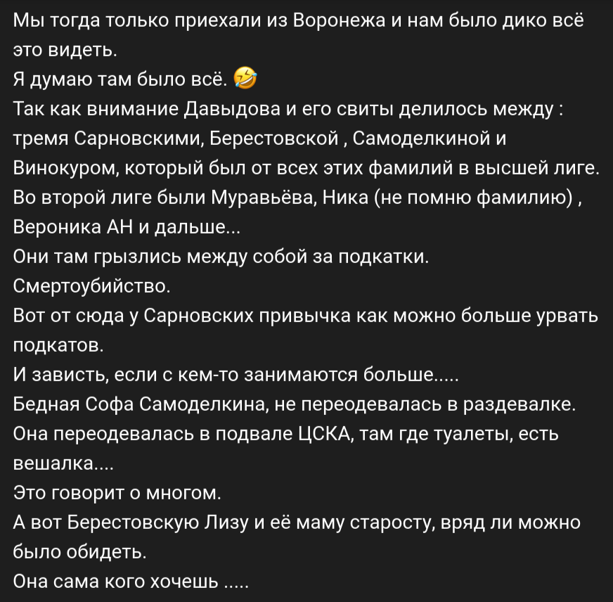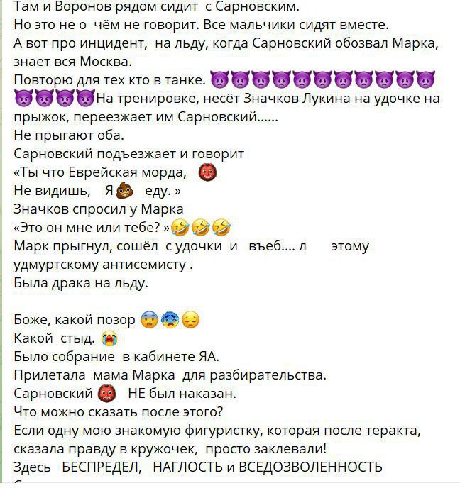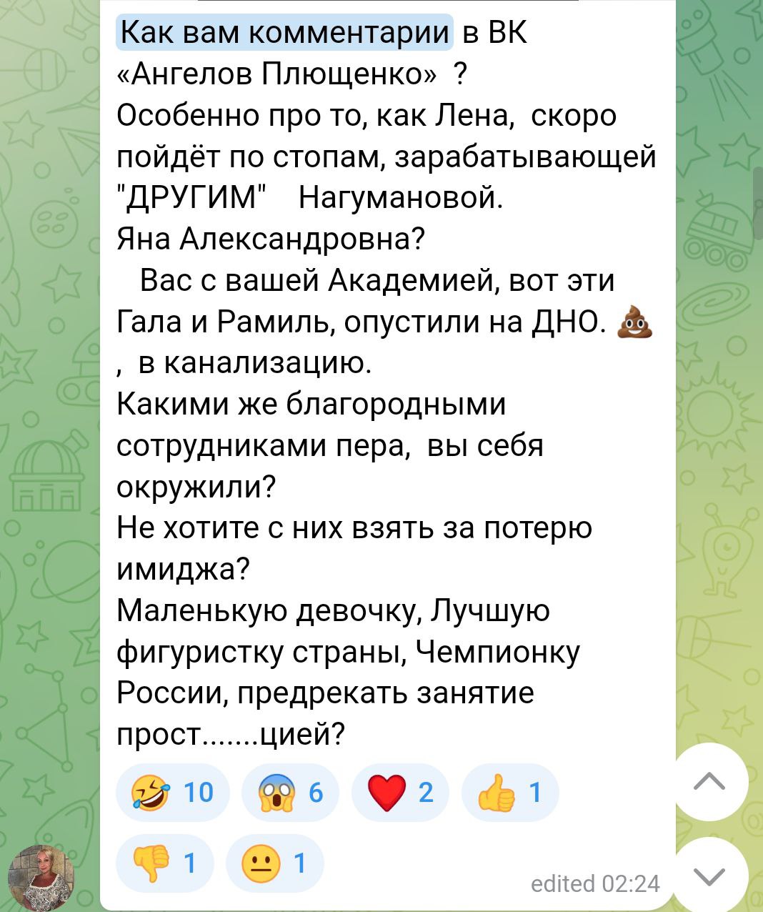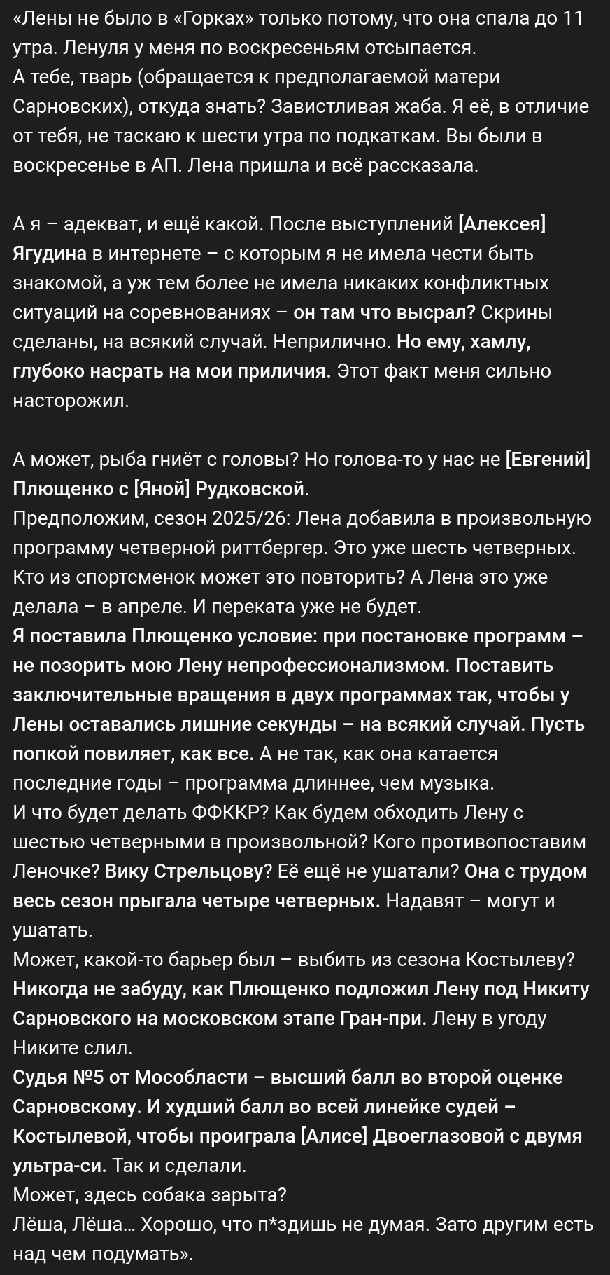 Сезон 2025-2026 "5 июня. Когда Лена не каталась и не прыгала с 13 мая, и только 2 июня, спустя 20 дней, впервые вышла на лёд - Плющенко тут же погнал её на тройные прыжки. Добить её сустав на третий день после выхода на лёд? Да, как только Лена 30 июня пришла после первой тренировки и сказала мне, что не может прыгать, по причине боли. И я о6 этом передала через, администратора Плющенко. Лена может только скользить на второй тренировке. Жалюзи на окнах в кафе, сразу поднялись. Скрывать больше нечего. Дело сделано. Я зафиксировала факт открытия жалюзей и всей коблы Сарновских восседающий у экрана на лёд."