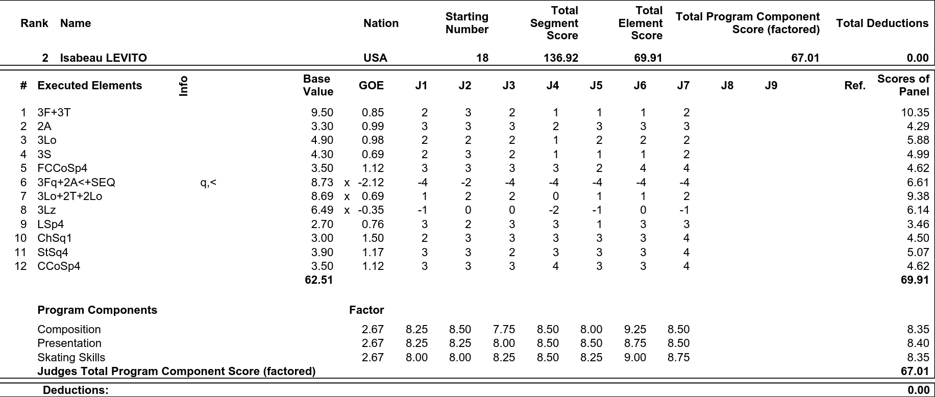 Isabeau LEVITO в чёрном 3z???3tq? 2a 3r 3s 3f2a 3r2t2r 3z клюнула, чуть рукой не коснулась chsq1 инна бауэр, прыжок в шпагат Сегодня разбудила дремлющую в себе Бабасян