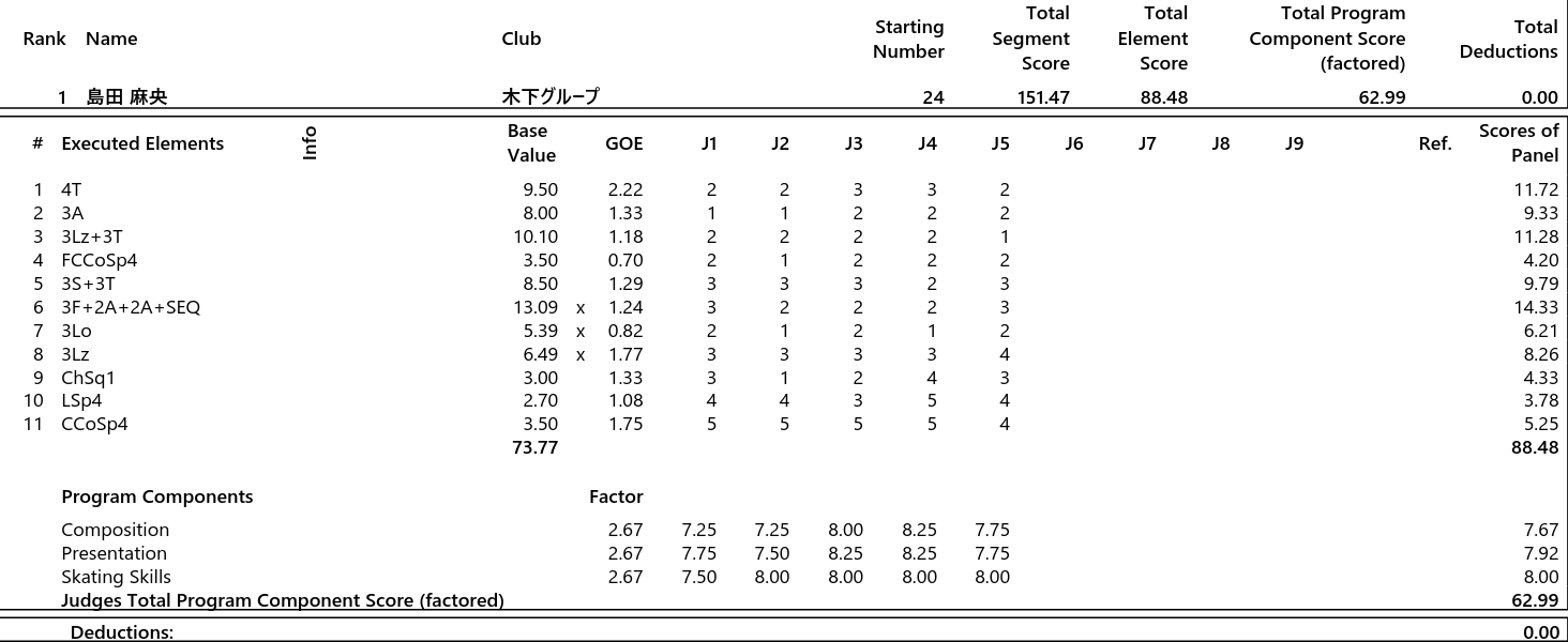 Sonja HILMER, USA 3f<?2t как-то не очень 3z<<? или это флип? 3t chsq1 гидроблейд 3f ??? на зубец в присядку 3r<2t 2r 3s ho 2a+seq +1a (каскад) в противоположную сторону визг комбинированное тоже в обе стороны визг