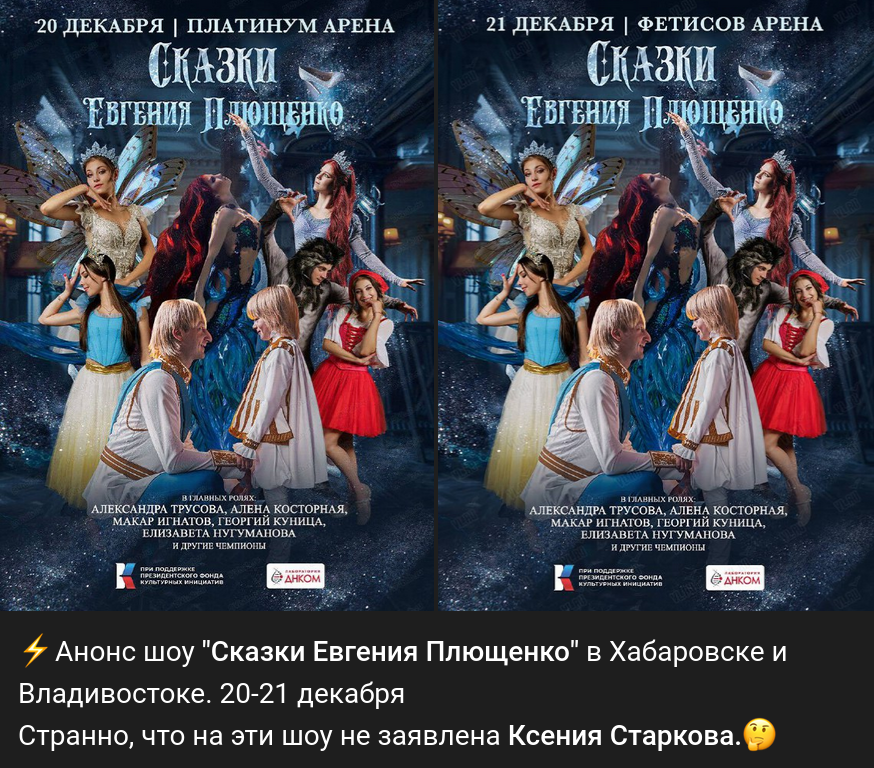 >Ледовое шоу "Сказки Евгения Плющенко" отменили. >Выступление именитой фигуристки Елены Костылевой, которое было назначено сначала на 11 апреля, а затем перенесено на 30 ноября 2025 года на G-Drive Арене, полностью отменили. Сайт Kassy.ru сделал рассылку на почту и СМС-оповещения об отмене. >Информация о предстоящем концерте также пропала с официального сайта шоу Плющенко.