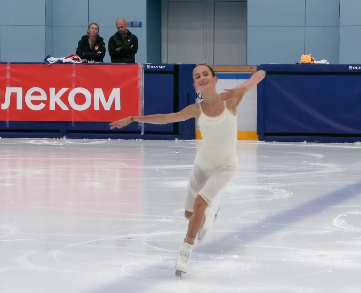 Camila VOLKOVA с Волковым и Волковой (т.е. с папой и мамой) >Камила давай ??? 3t fall +combo полукубарем 2a такая транса что ничего не поймешь, ютуб считай можно не смотреть 3r ??? wobbling? колени не гнутся, типичная русская фигуристка.