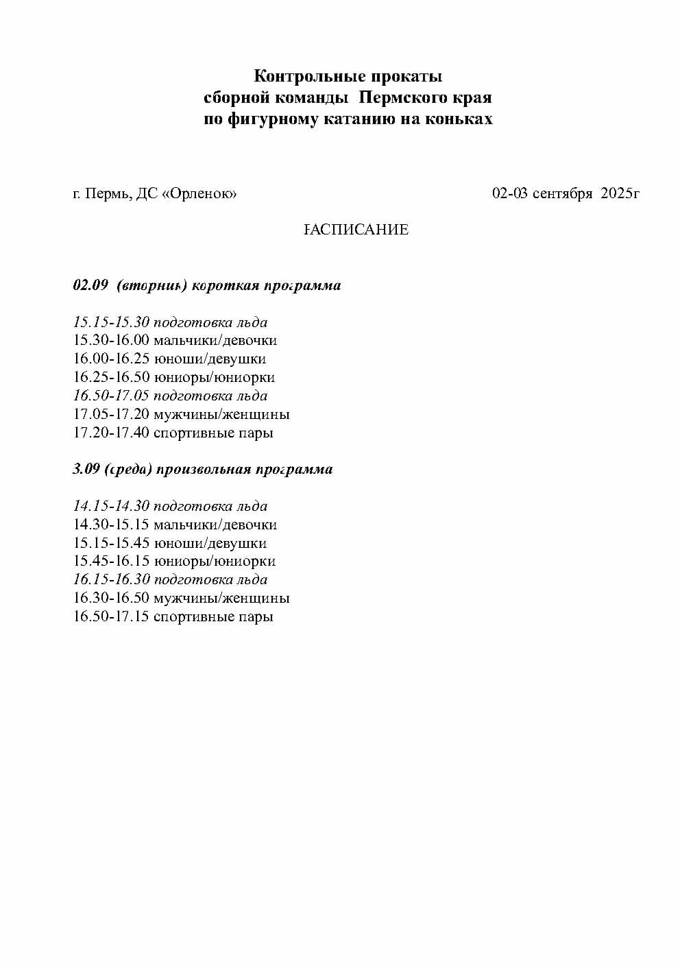 02-03 сентября, Контрольные прокаты сборной команды Пермского края по фигурному катанию на коньках, Пермь, ДС «Орлёнок» Виктория Федянина, Скулкина Екатерина, Энкина Маргарита, Пискотина Александра и др. Инфо: https://vk.com/roo_pk Табло: https://бильман.рф/perm/KonPr_25/ Транса: https://vk.com/roo_pk