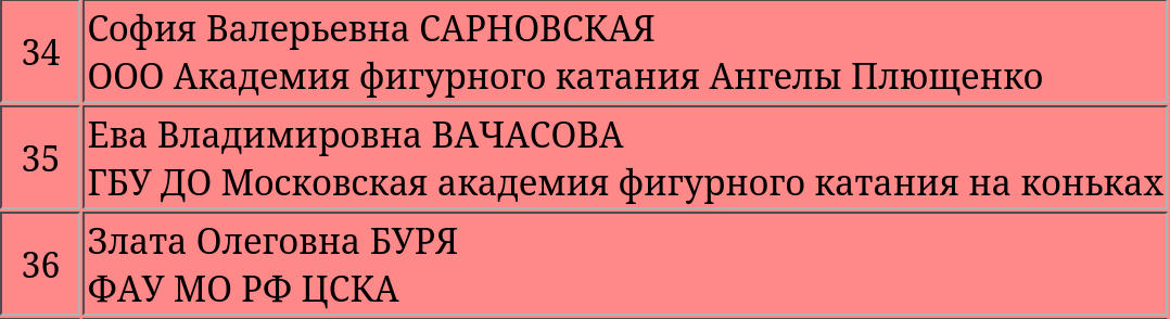 02-03 сентября, 1 этап Кубка Санкт-Петербурга, СПб, АФК (Туполевская 4А) МС. Отборочный турнир для 1 и 2 этапов Гран-При России: Гущина Ксения, Захарова София, Зубкова Ева, Киселева Елизавета, Кудлай Арина, Кшецкая Арина, Муравьева Софья, Нестерова Виктория, Овчинникова Валерия, Пулина Мария, Свириденко Полина, Фурсова Людмила, Чаткина Александра Блинникова Алиса, Кадырова Ясмина, Симонова Мария, Москалева Анна, Карпук Анна Инфо: https://fskating.spb.ru/competitions/tpost/sfb04vo9d1-kubok-sankt-peterburga-1-etap Транса: https://vk.com/figureskating38
