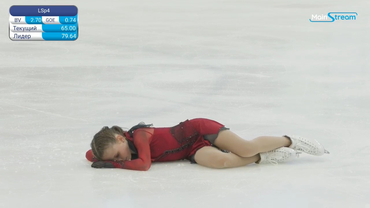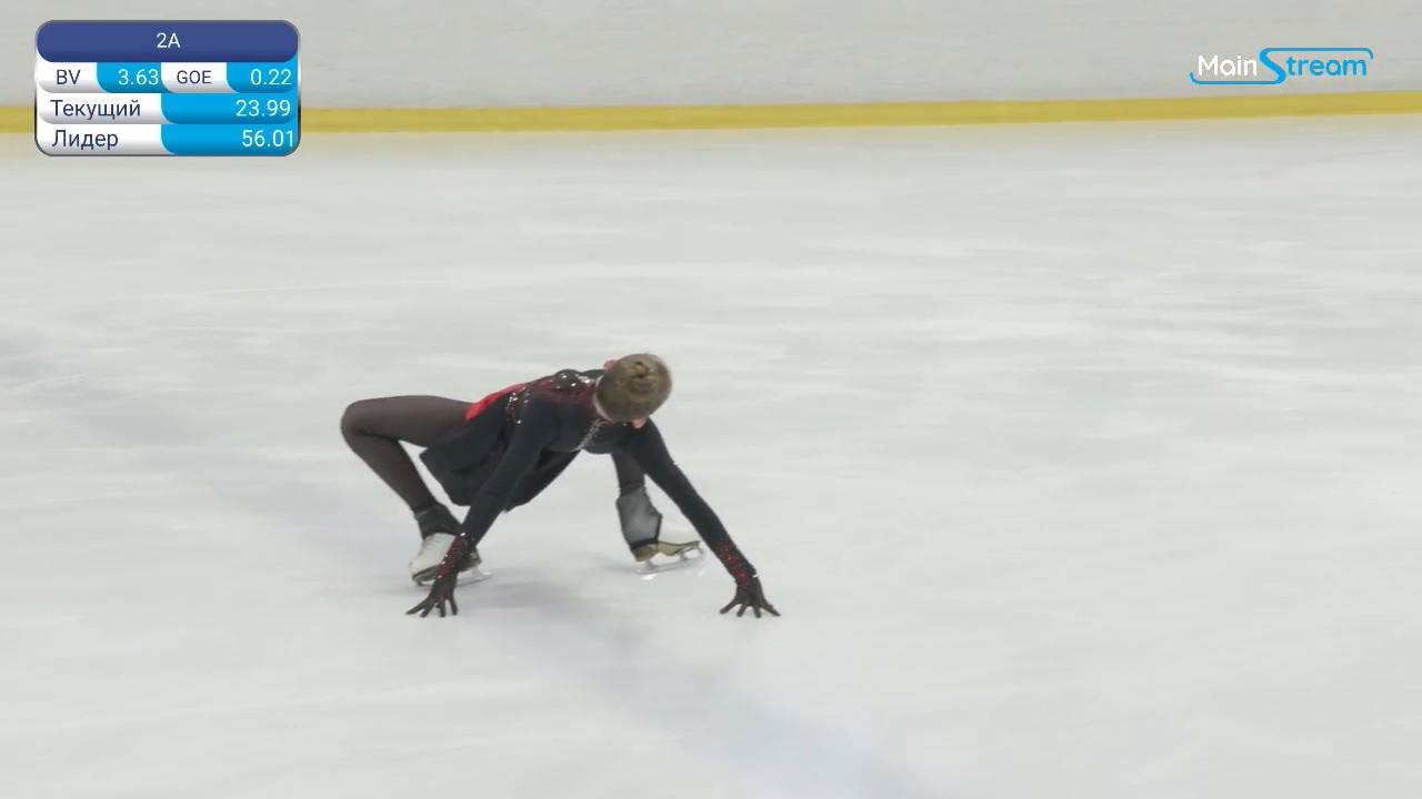Елизавета Алексеевна МЫШКИНА, 15 лет (20 марта 2010) АНО Лига Фигурного катания, Завозина (Камышка не указали) сидит на льду, завывания Левиафана 3f3t< 2a so закрутило fall на руки грибочек-комочек 3r stsq3 с разворотом в слайде когда мелодия левиафана сменилась в конце на американский гимн, не успела