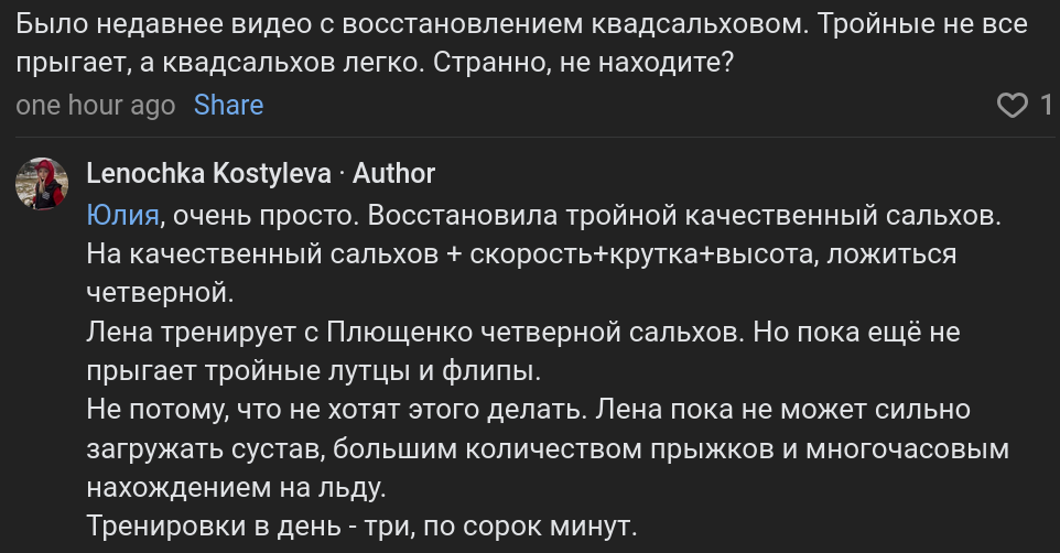 >— Какую цель ставишь на этот сезон? >— Прокатать произвольную программу с еще большим количеством четверных прыжков, не только с сальховом, и улучшить вторую оценку. Сколько хотела бы в идеале четверных прыжков в программе? Наверное, четыре для начала, — сказала Дарья Лебедева «Матч ТВ». Ну и нафига эти 4 квада? Лучше б трикселек выучила к сальхову и хватит.
