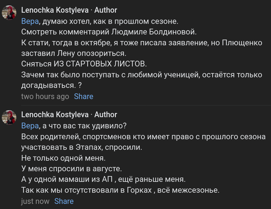 Предыдущий: >>3235188 (OP) Ну и какого хрена, сколько можно просить не ставить всяких Костылевых на ОП-пик? Ирину Алексеевну забанили в тг. Андреева выпустила влог с готовкой. Dmytro Dmytrenko разочаровался в украинском фк и тренирует какую-то Максиму из EVH (Энгельсы Плющенко). Германию на этапе ЮГП будет представлять некая одиночница Diana Alexandra ZIESECKE из Москвы, бывшая ученица Федченко и Черкасовой. Опять роем себе яму, на которой сидим. Бранденбург ушла к Розе, сравним с результатами у Этерички. Ткачман тренируется на катке Юлии Заутер. У половины украинок хобби "акробатика". Этеричка с Дудачком исчезли из списка бывших тренеров Бранденбург. Хейтеры, указавшие телефон Костылева Валерия, мужа Ирины Костылевой, зашифровывают в фотографиях Софии какие-то грязные послания. Вполне ожидаемо, что одна и та же фотография на канале Сарновской, и на фейковом канале, созданном завистниками (куда она загружена всего на 35 секунд позже) различаются по содержанию. Эмилия Нахаева перешла в августе в группу Юлии Липницкой. У Дзепки уже в фанатах модельеры с мировым именем. В семье Плющенко и Рудковской скоро ожидается пополнение. Мария Казакова встала в пару с Владиславом Касинским. Злата Саприна пригласила Kitty на свой день рождения. Дина Хуснутдинова пришла на просмотр в группу Этери Тутберидзе. У Любовки в позвоночнике расшаталась конструкция, установленная ранее в рамках предыдущей операции на спину. Стрельцова с годами станет похожа на актрису Светлану Смирнову. В Хрусталь тянет Хуснутдиновых, Щербаковых и Парсеговых, уже по несколько штук. Сейчас, правда, времена щербаковых/хуснутдиновых прошли, там топов тупо собирают. Федерация Санкт-Петербурга сделала рейтинг фигуристок. Нерсесян лишь третья, должны переделать рейтинг. Трусова продала коньки. another PINK FLOYED crap program. У Спрутика торчит косточка. Умер спортивный врач Виктор Аниканов. Тотальное доминирование эстонского фк в лице Крисы и Крысы. Финны выращивают свою Йозефину. Румын писал, что фракийцы - балты; хотя есть теория, что они родственны фригийцам и армянам. Объясняющая, почему у Фомченковой и Пашиняна похожие имена. Другое объяснение придумать сложно. Аргентинского тренера Рыбникова, похоже, не пустили в Латвию. Пермских камалдиновы уже не интересуют. Зажрались. anyone watchy-watchy rythm gymnastic WORLDS? with hyper-nyashka? Ковязину совсем засушили. Ирина Костылева вышла на связь с аккаунта мужа. Слухи подтвердились, Мариничева ушла в Барсы. HUH не стала обниматься с Дибберн. Какой-то Ионафан Елизарян выиграл золото. Армянское доминирование на турецкой земле. Бакушева участвовала в том самом Ice Star, с которого сняли Петрову (за то, что она выступала за Армению без разрешения федры). Самое идиотское, что до этого именно Фартушину выбрали для обучающего ролика на тему "Как снимать мерки с фигуриста". Миланка Ромашова страдает в Москве без Хуенгра. Бутазов рыгнул. Степченко диагностировали ПТСР. Ковалькова - это та самая трудноотоличимая от Гэмбилл тренерша. Отличие в том, что у Гэмбилл кладбище больше. Каревы в основном известны как тренеры прыгающих фигуристок (Графова, Гоголева, Шмелева) и пар. Д.Дрожжина из Буревестника СПб, одногруппница дочки Быстрова, тренеры Меньшов и Агеева. Слуцкая из Мытищ, одногруппница Майи Градусовой, группа Семишиной. Шепталина - одногруппница Виктории Морозовой (той самой) и Алисы Поляковой, группа Щеве