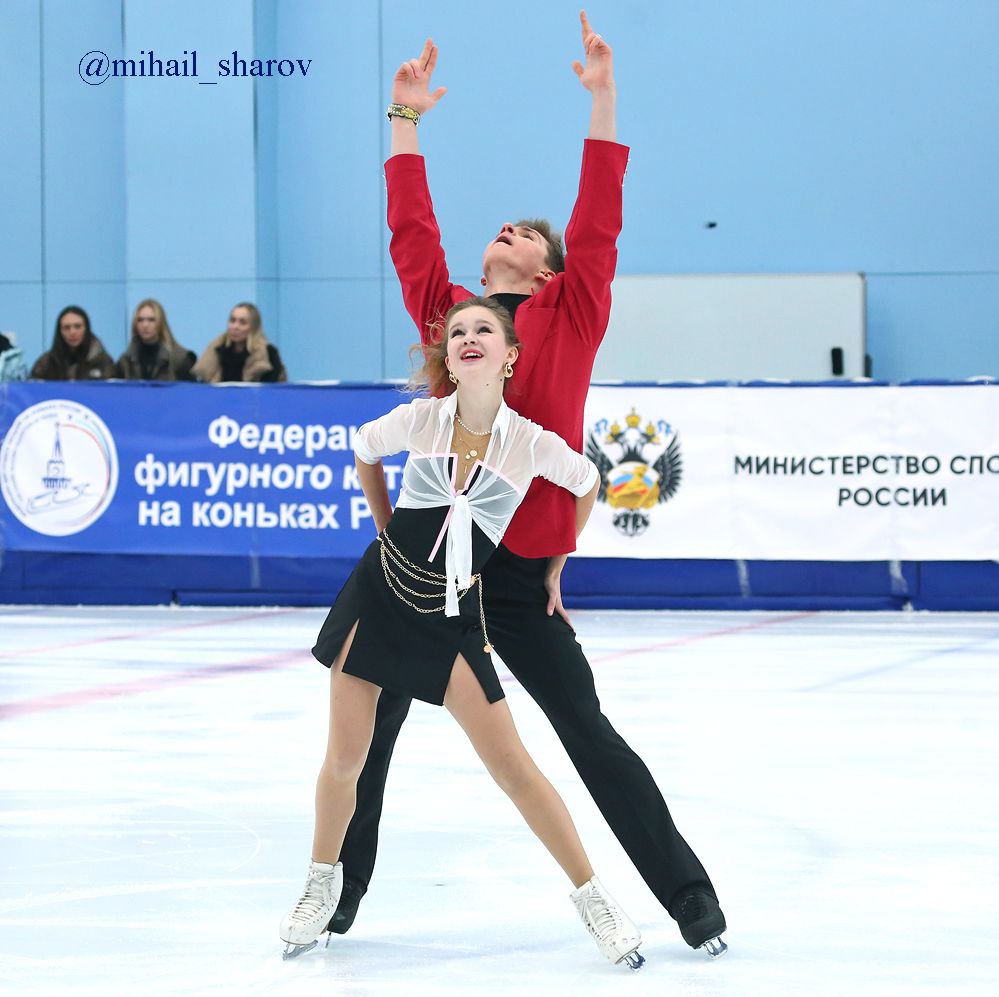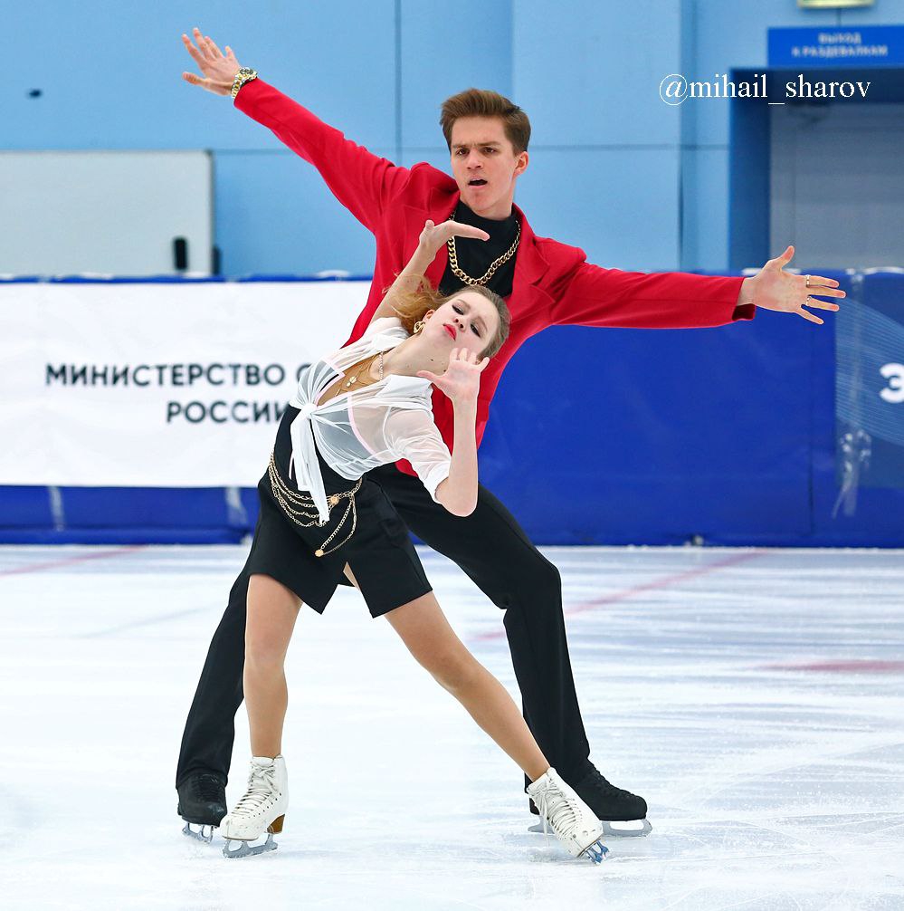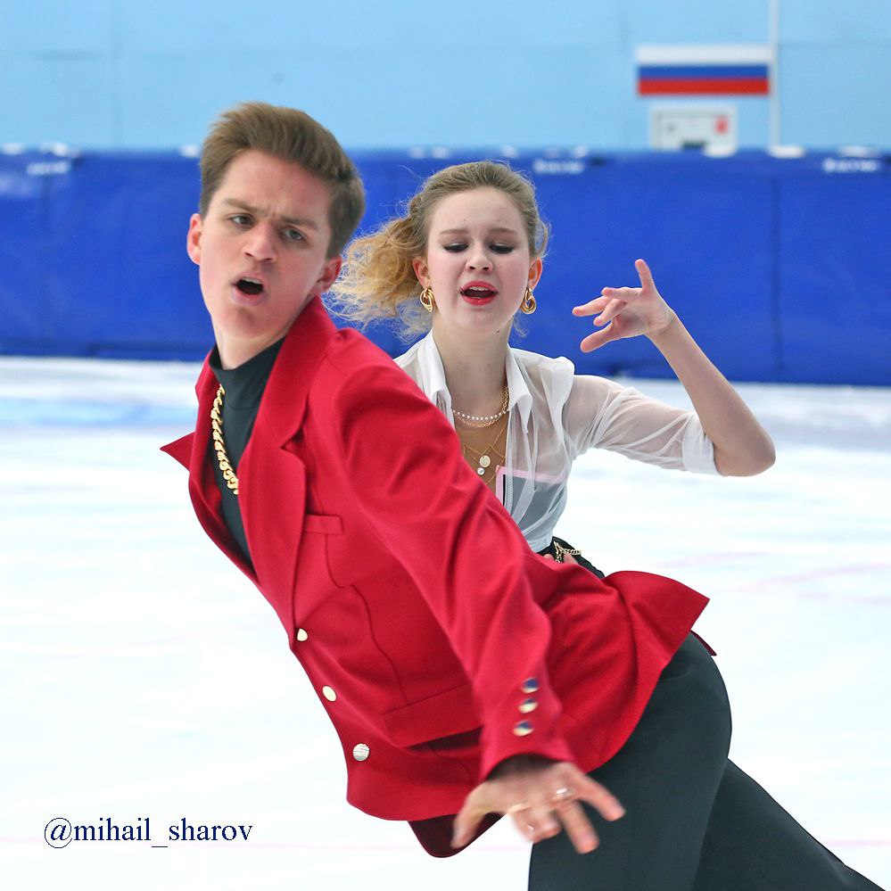 Софья Михайловна МАРИНИНА / Роман Максимович ЧЕРНЕНКО в стали в стартовую позу, музыку не включили. Они сделали какой-то ритуальный тайный вращательный жест пальцем и пошли раскатываться. Маринина отрастила ногти и покрасила их в ярко белый. Напоминает Парсежку из параллельной вселенной, которая ушла в пары.