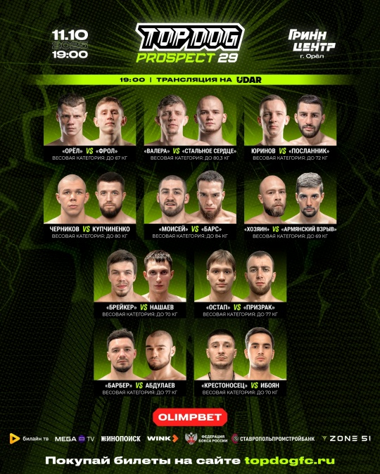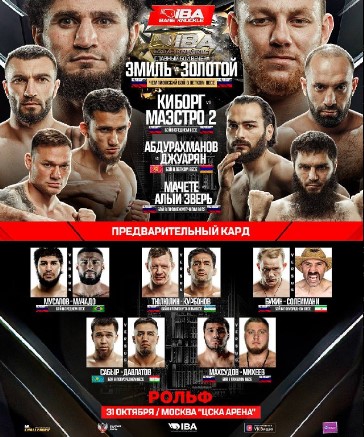 Зияев - Кореец. Победа Зияева нокаутом или отказом угла Корейца после многочисленных нокдаунов. Кореец - совсем никакущий боец. Самат - Кадиев. Победа Самата по очкам. Но бой будет ужасный - Самат будет падать в стиле Золотого и ныть. Мамиев - Абдулджабар. Победа Абдулджабара по очкам, который также будет падать. Букин - Тандовский. Победа Тандовского ввиду отказа угла Букина или ввиду явного преимущества. Букин соберёт головой все удары, но сдаваться не будет. Авдал - Баркинхоев. Победа Авдала по очкам.