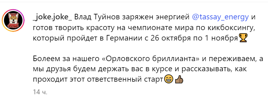 Владислав Туйнов @_joke.joke_ в очередной раз стал Чемпоном Мира по кикбоксингу! В разделах фул-контакт и К-1. Чемпионат мира проходил во Франции, где Влад гордо и уверенно представил нашу страну. Владу дальнейших успехов на боевом поприще. Большой молодец!