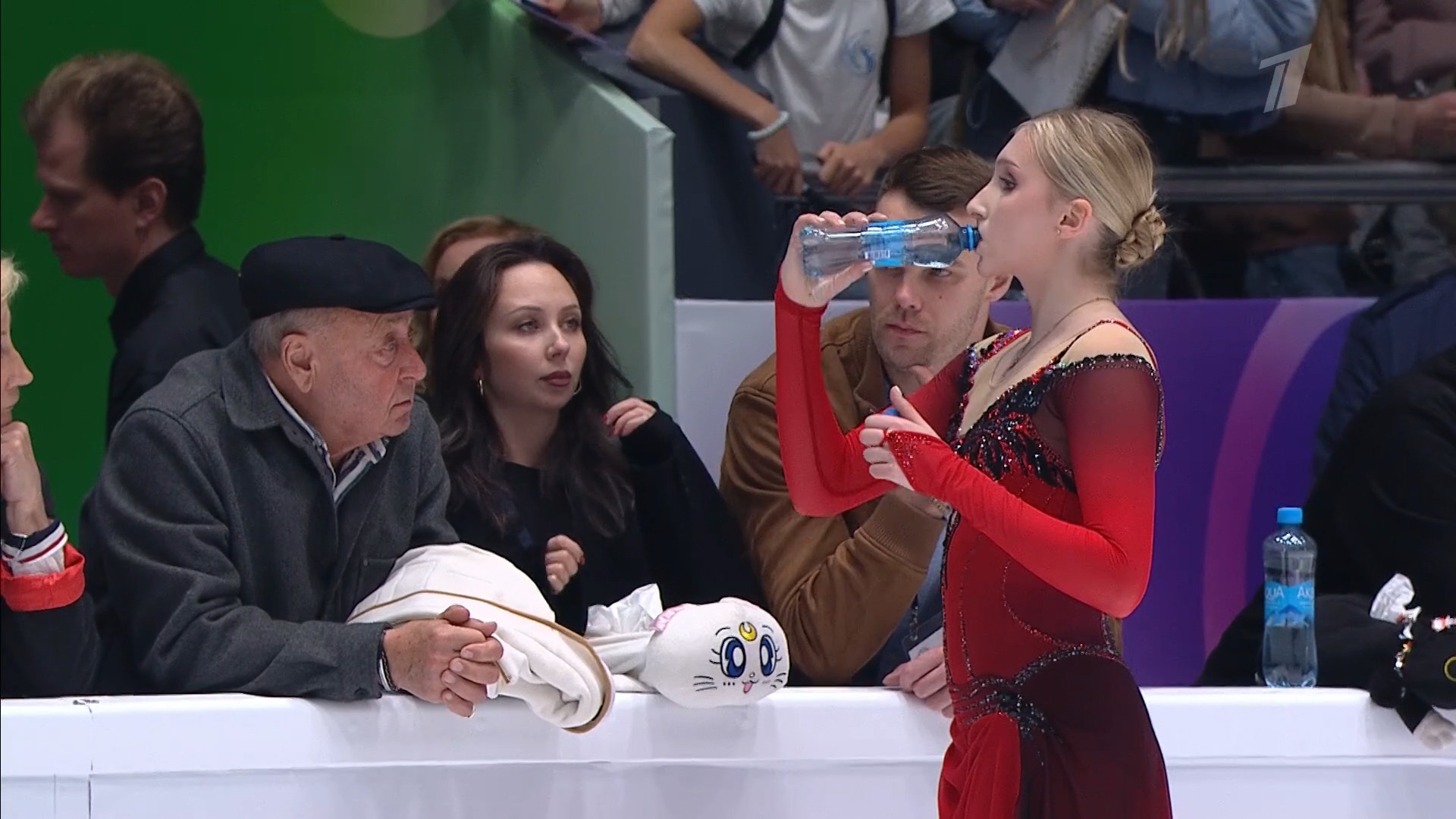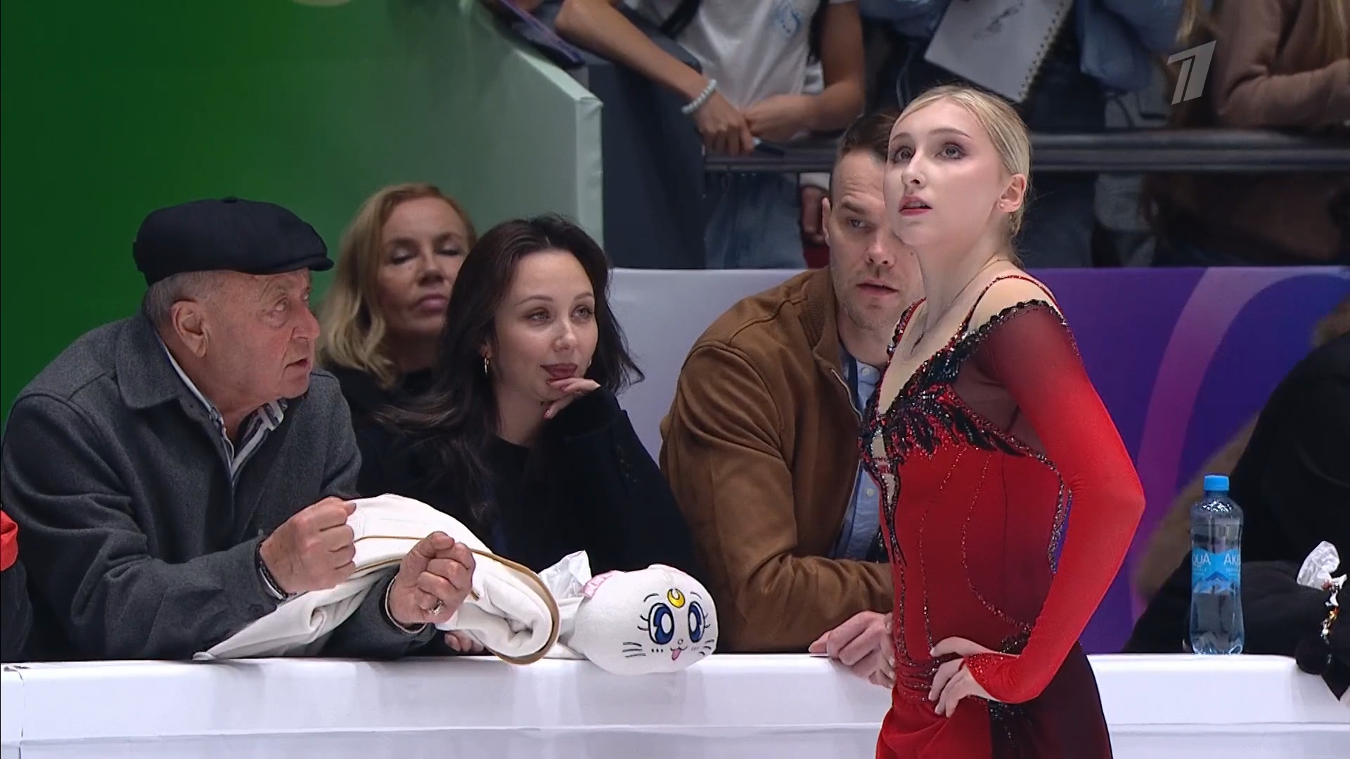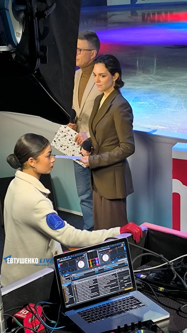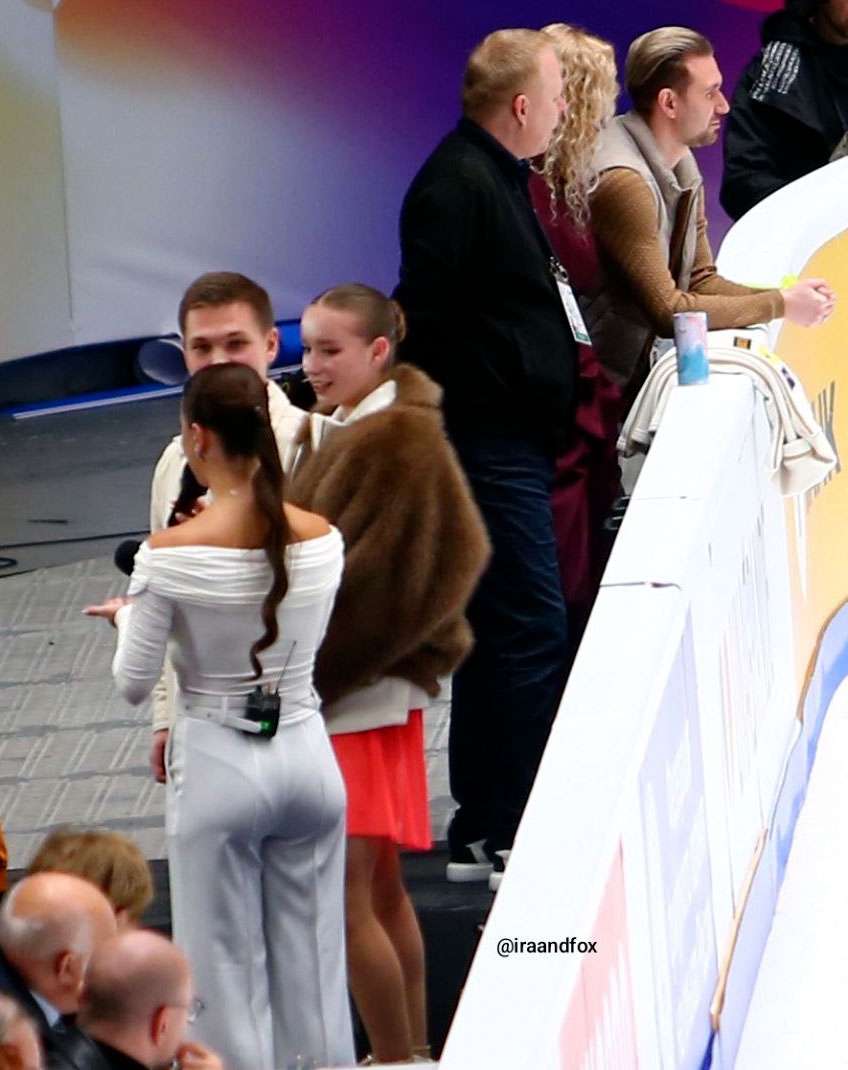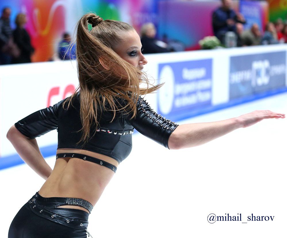 Одна няшка еле откатала свою пп второй раз за день, после чего высунула язык. Вторая няшка выскочила на лёд, ей закричали "куда???!!!" чем рассмешили няшку с микрофоном.
