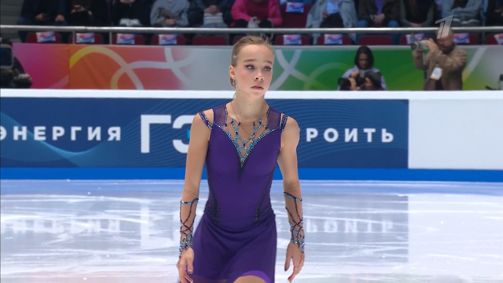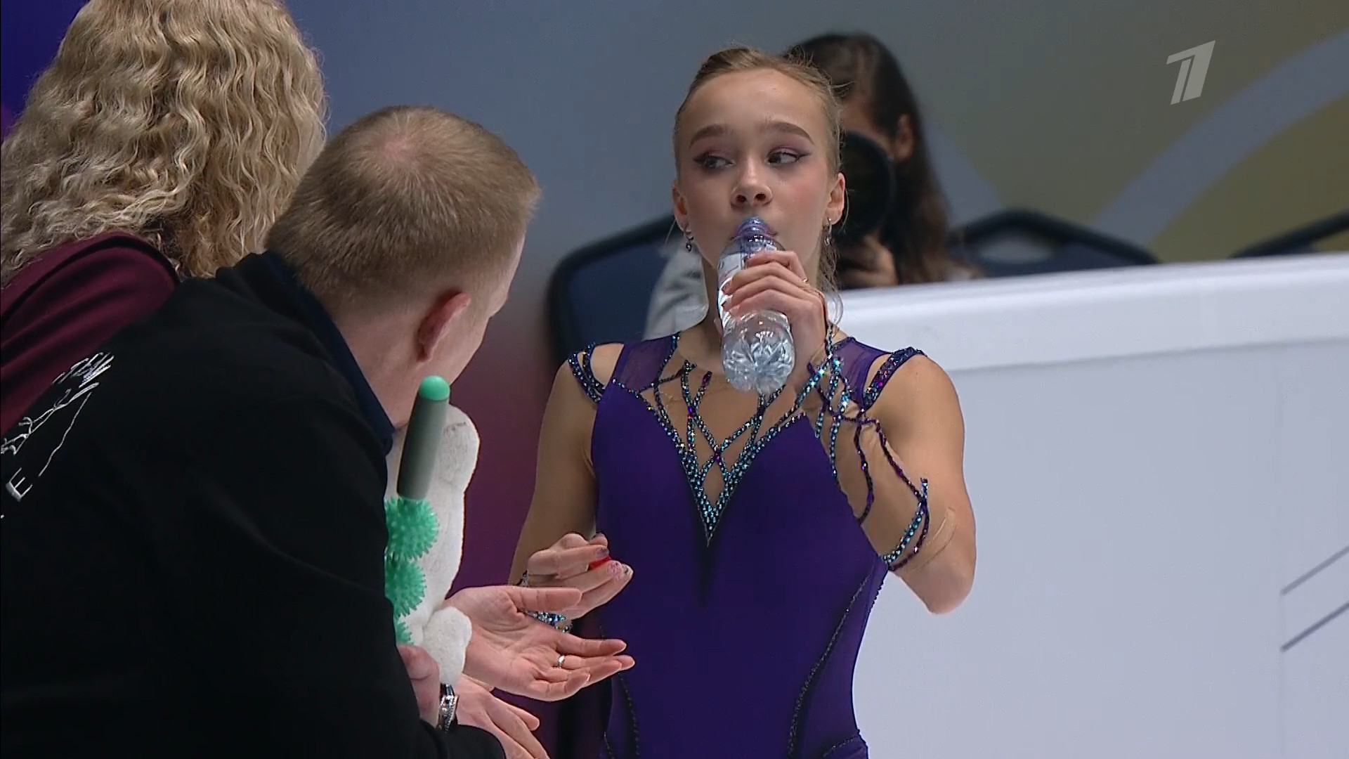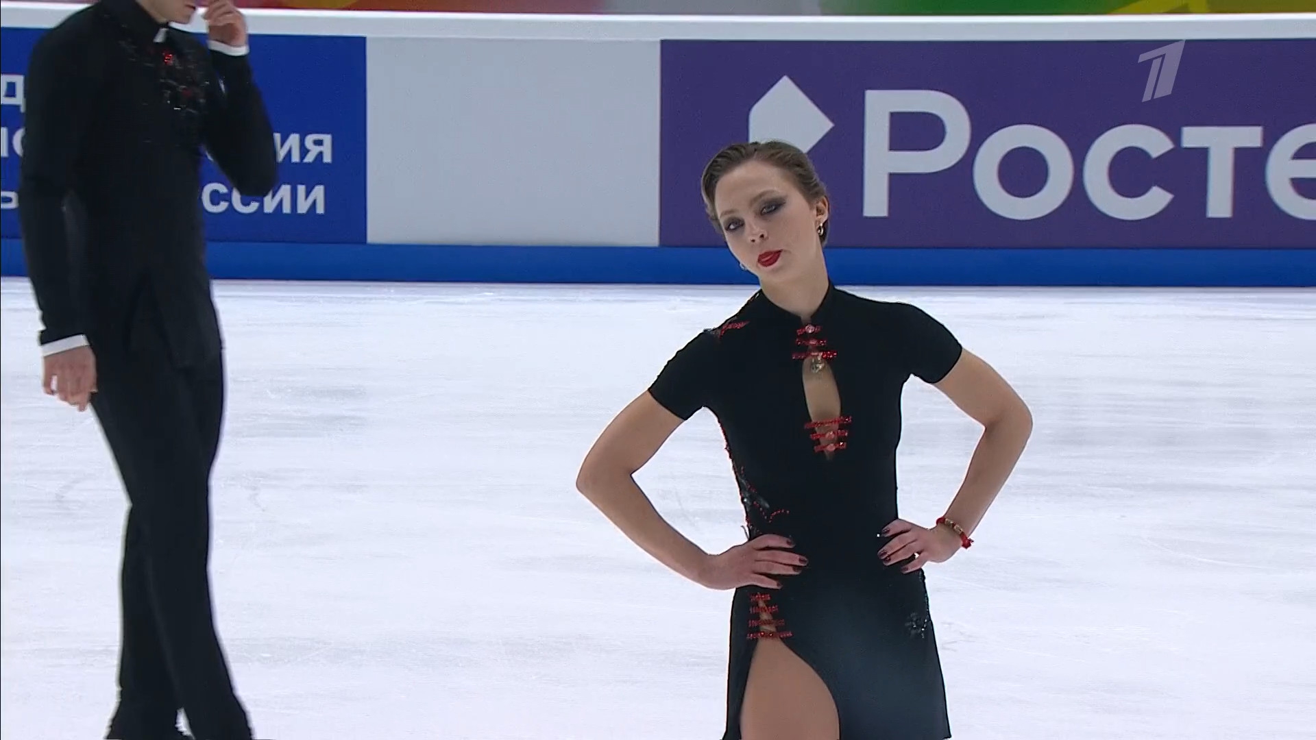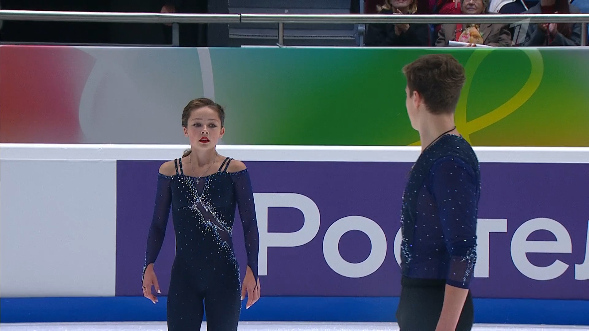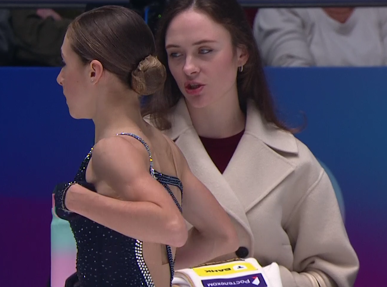 Одна няшка еле откатала свою пп второй раз за день, после чего высунула язык. Вторая няшка выскочила на лёд, ей закричали "куда???!!!" чем рассмешили няшку с микрофоном.