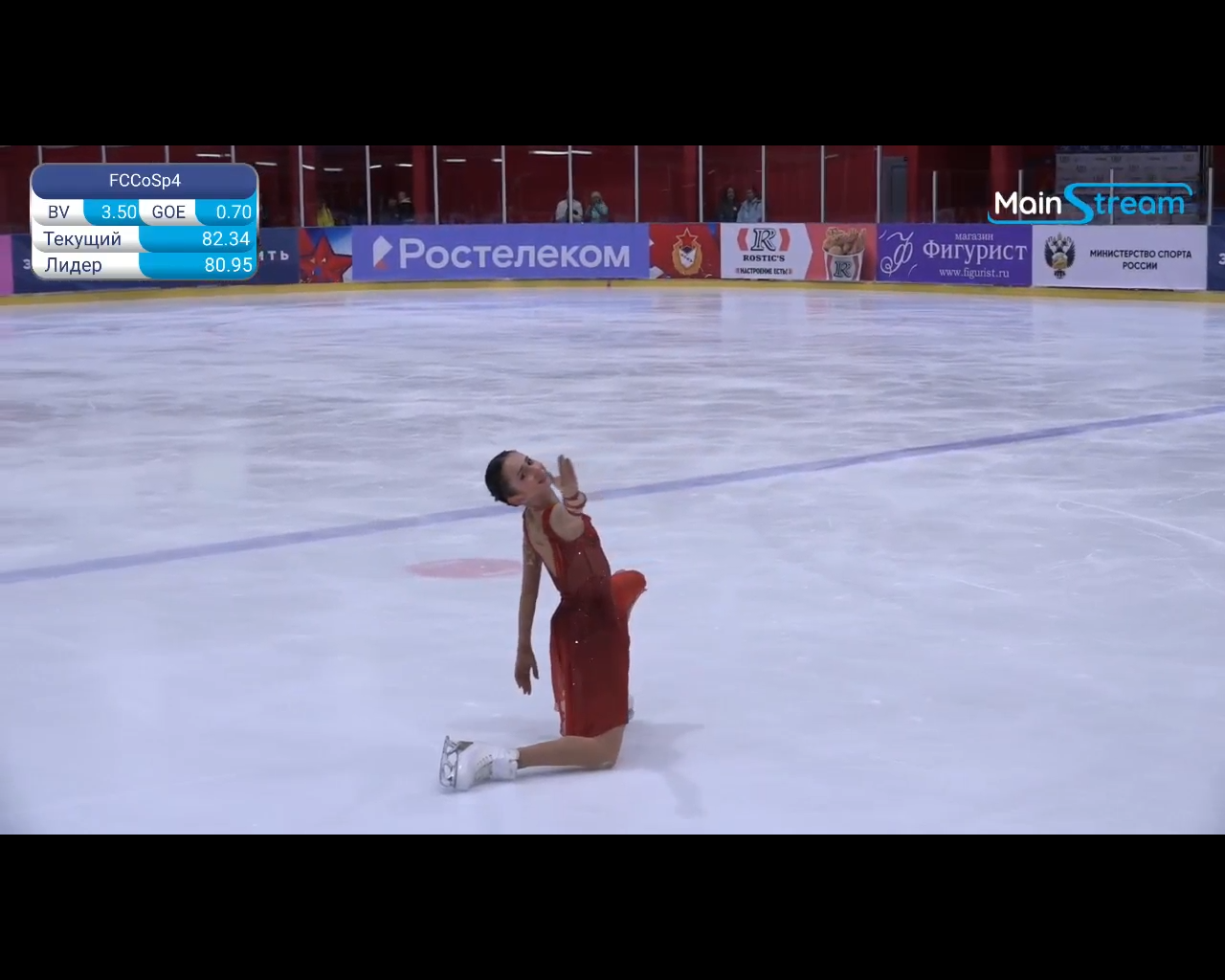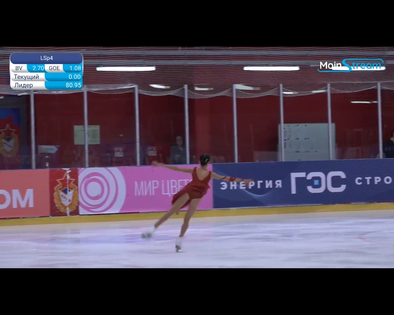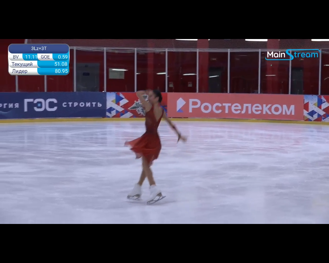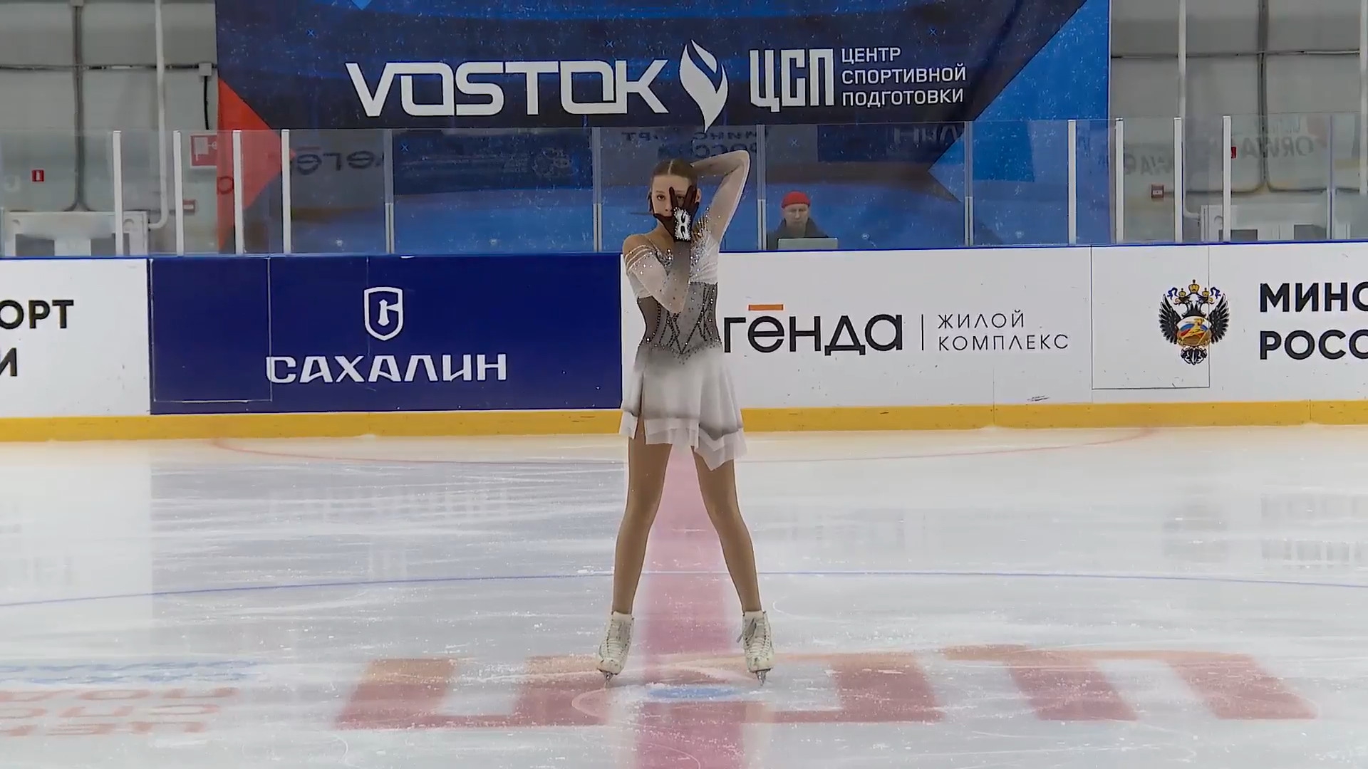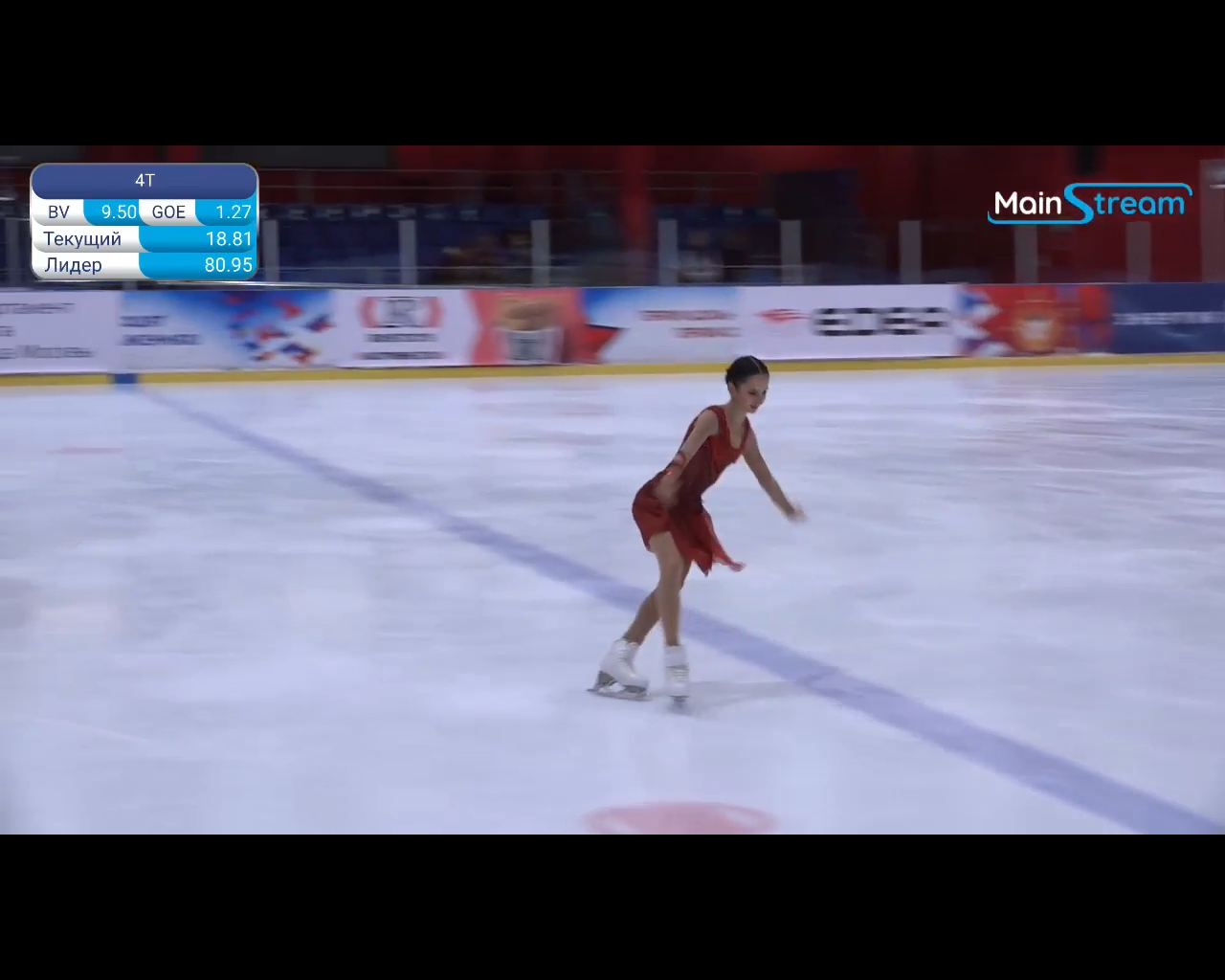 Алёна Витальевна Пяткина, СШ ОГАУ "Кристалл", Южно-Сахалинск в красном сарафане выдыхает у борта перед стартом 3r русская-народная дорожка 3sq2t танцует на зубчиках 2a fall с бести