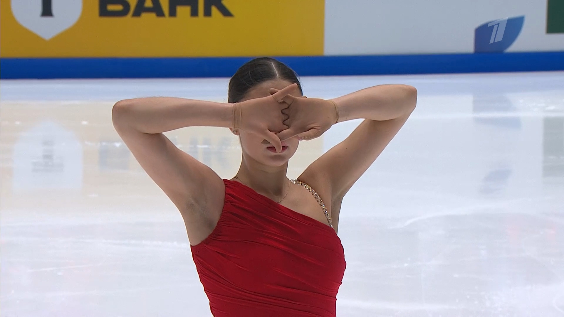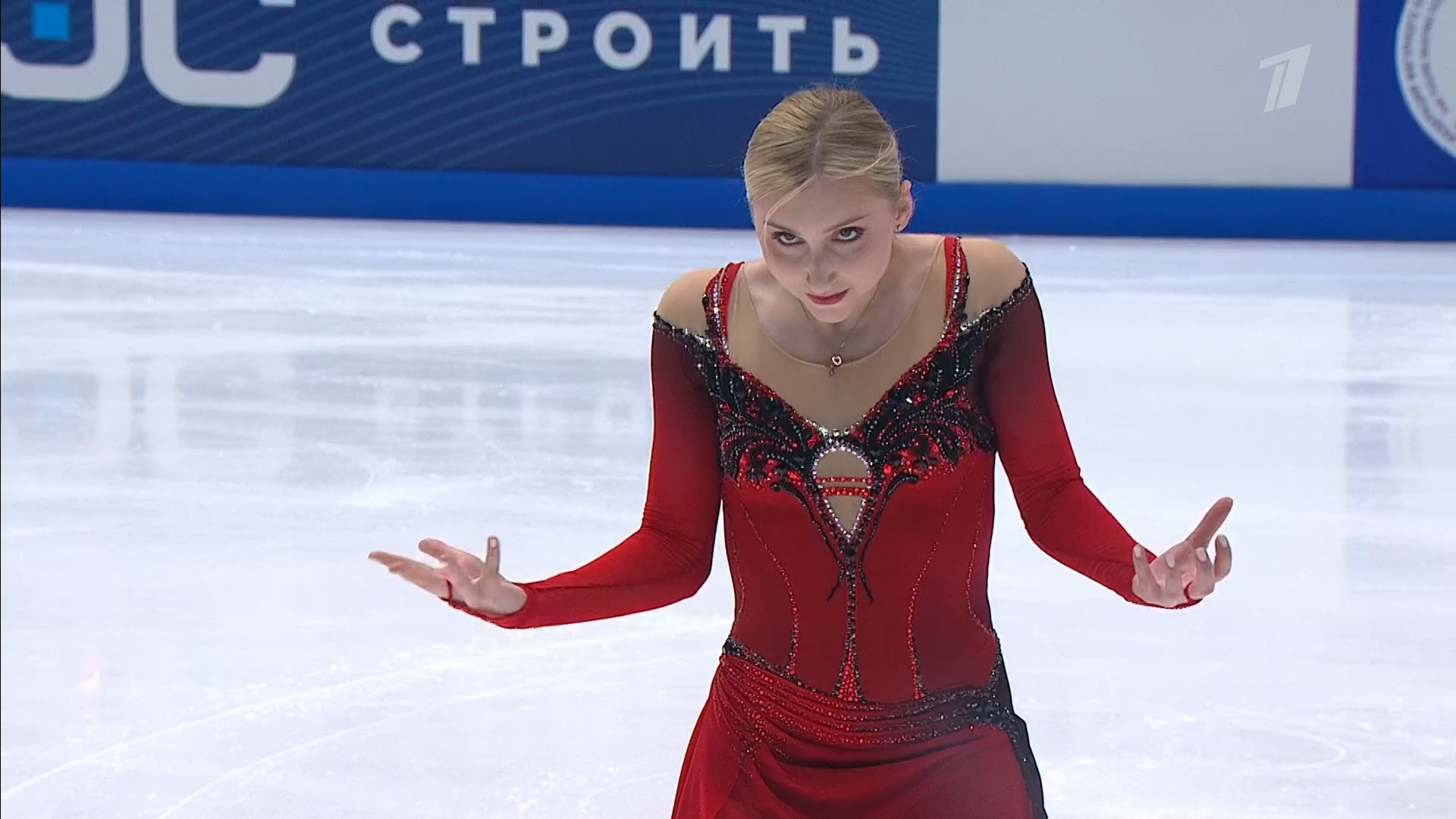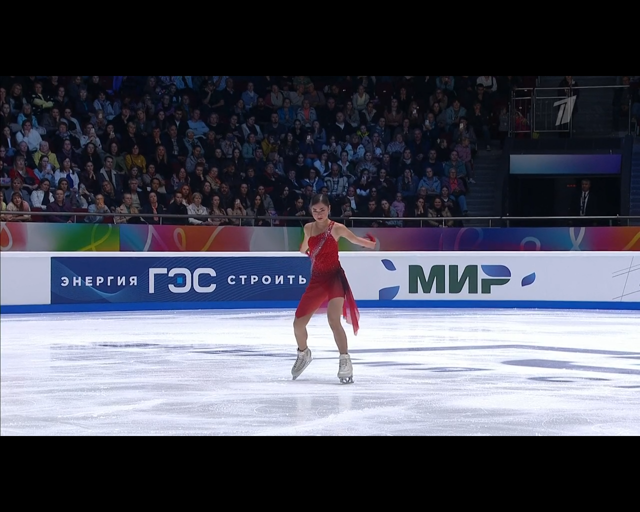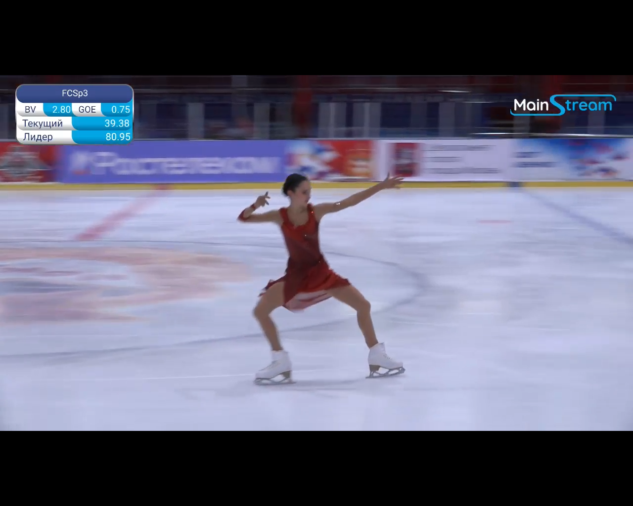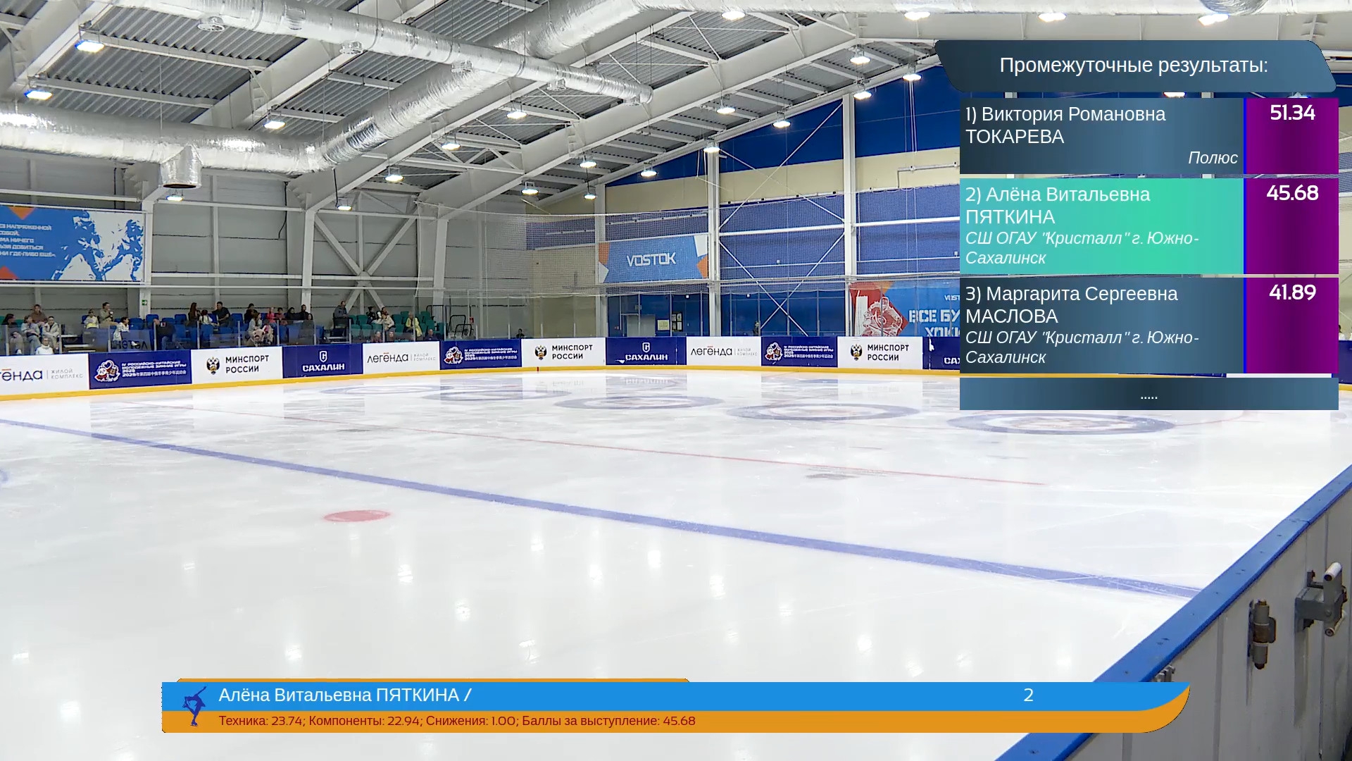 Алёна Витальевна Пяткина, СШ ОГАУ "Кристалл", Южно-Сахалинск в красном сарафане выдыхает у борта перед стартом 3r русская-народная дорожка 3sq2t танцует на зубчиках 2a fall с бести