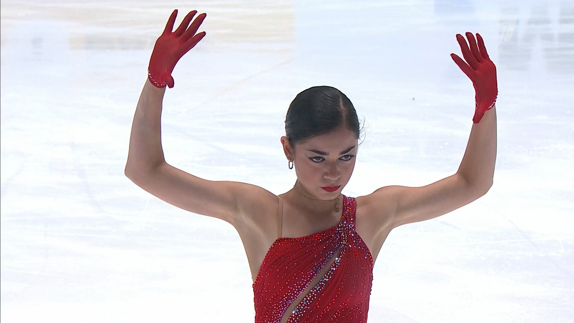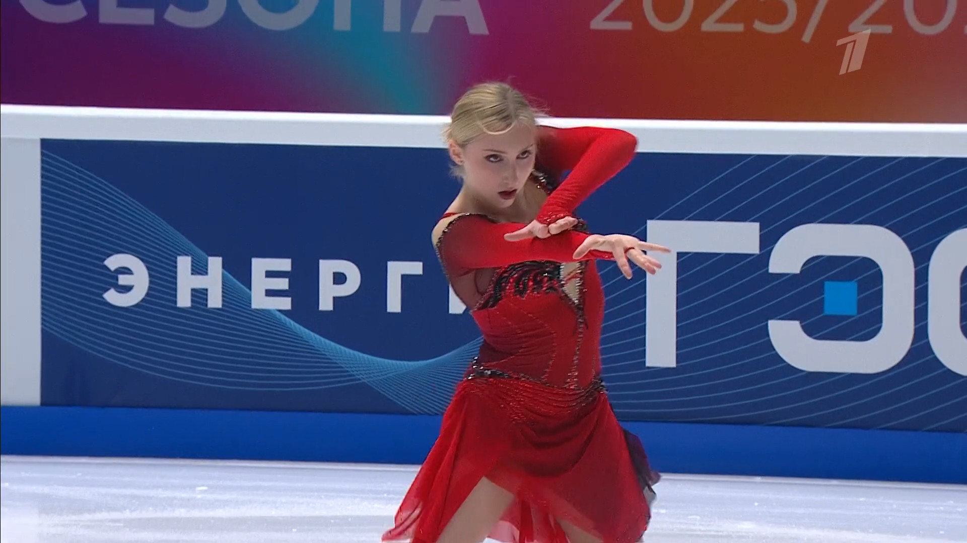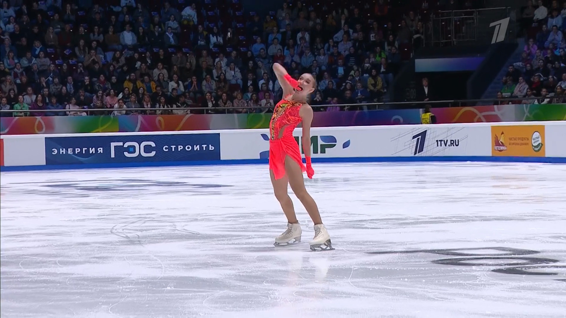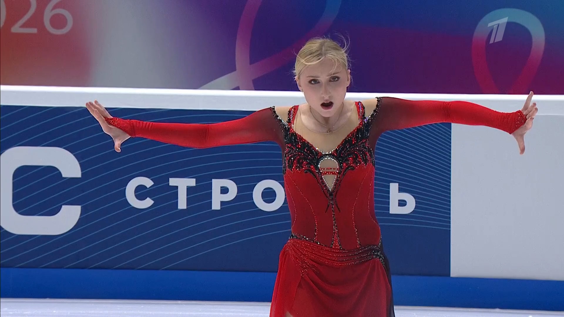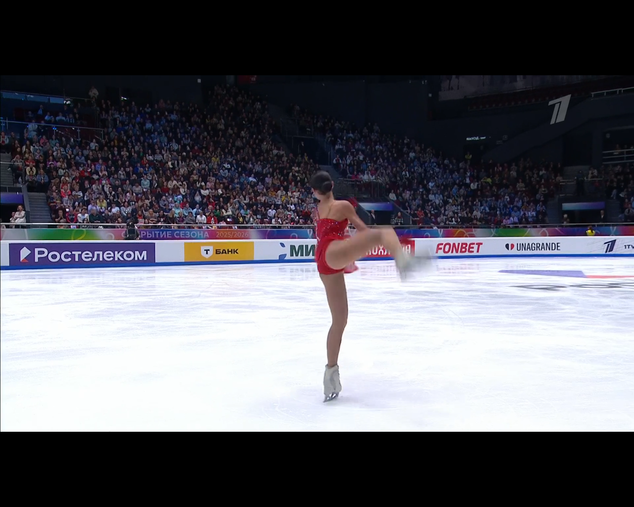 Алёна Витальевна Пяткина, СШ ОГАУ "Кристалл", Южно-Сахалинск в красном сарафане выдыхает у борта перед стартом 3r русская-народная дорожка 3sq2t танцует на зубчиках 2a fall с бести