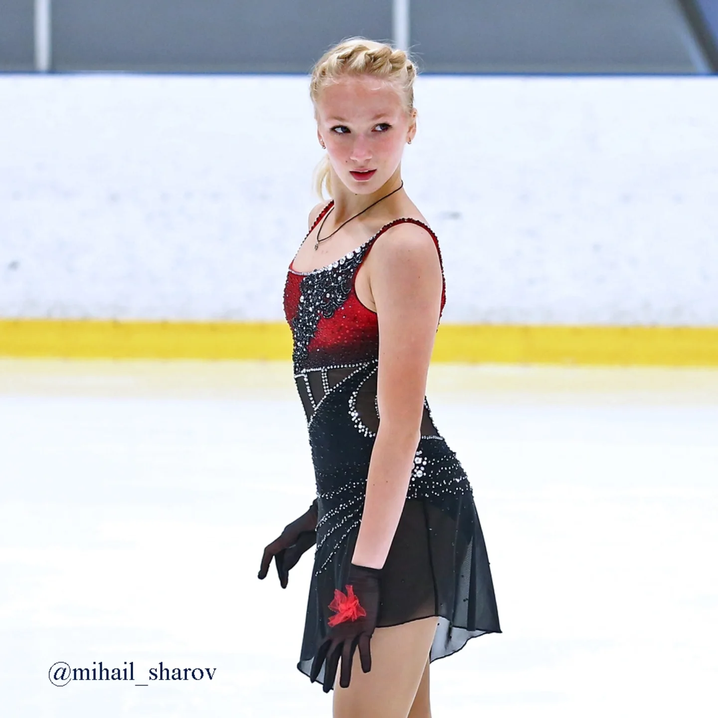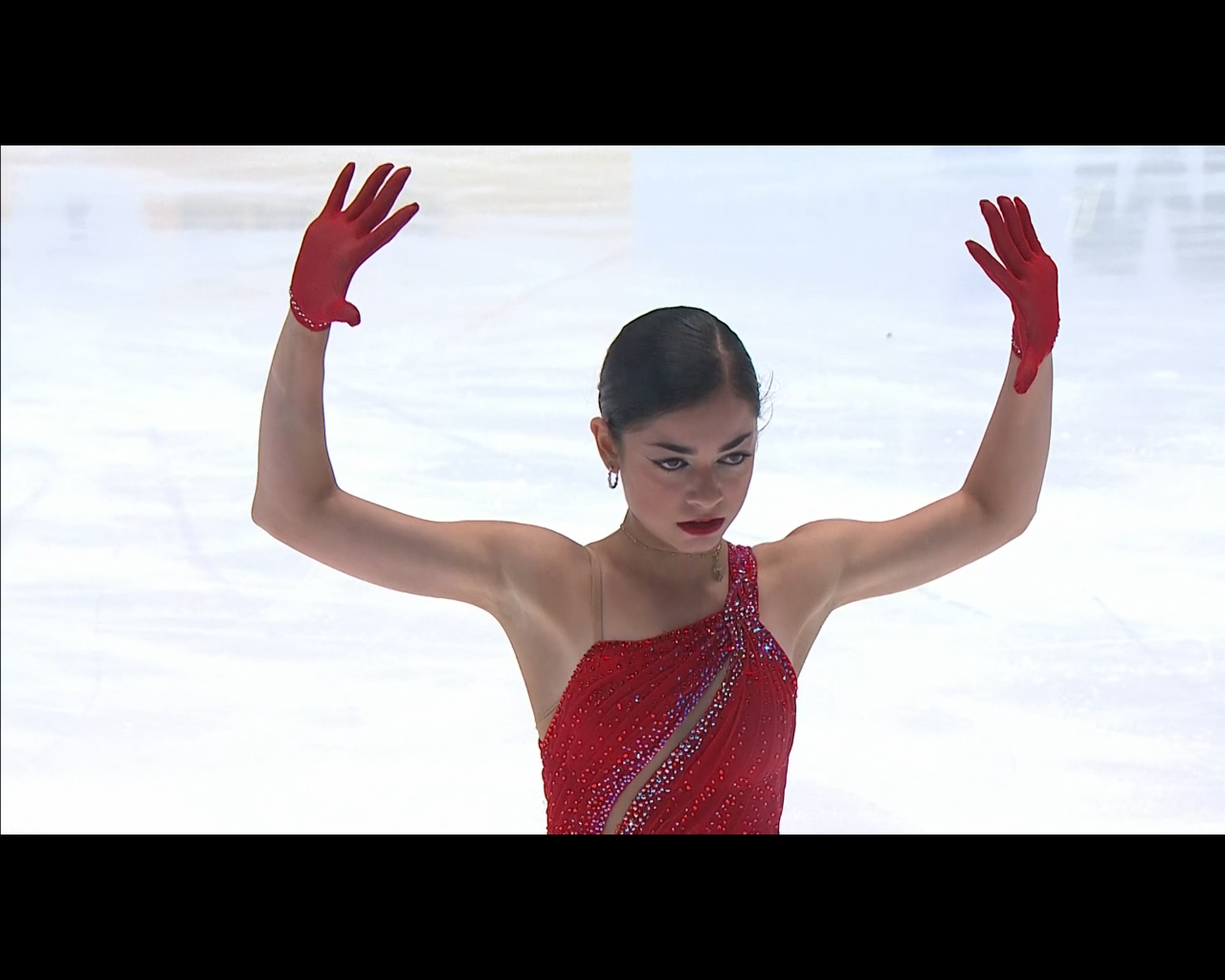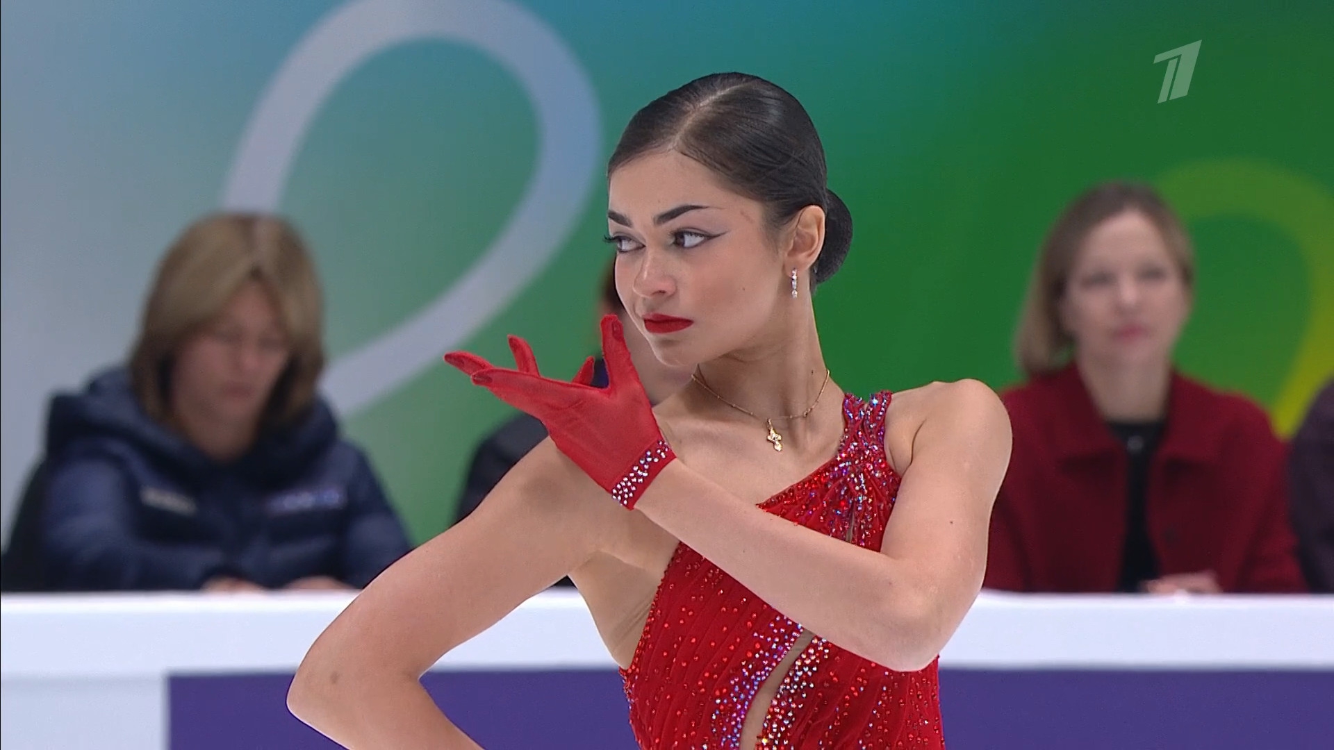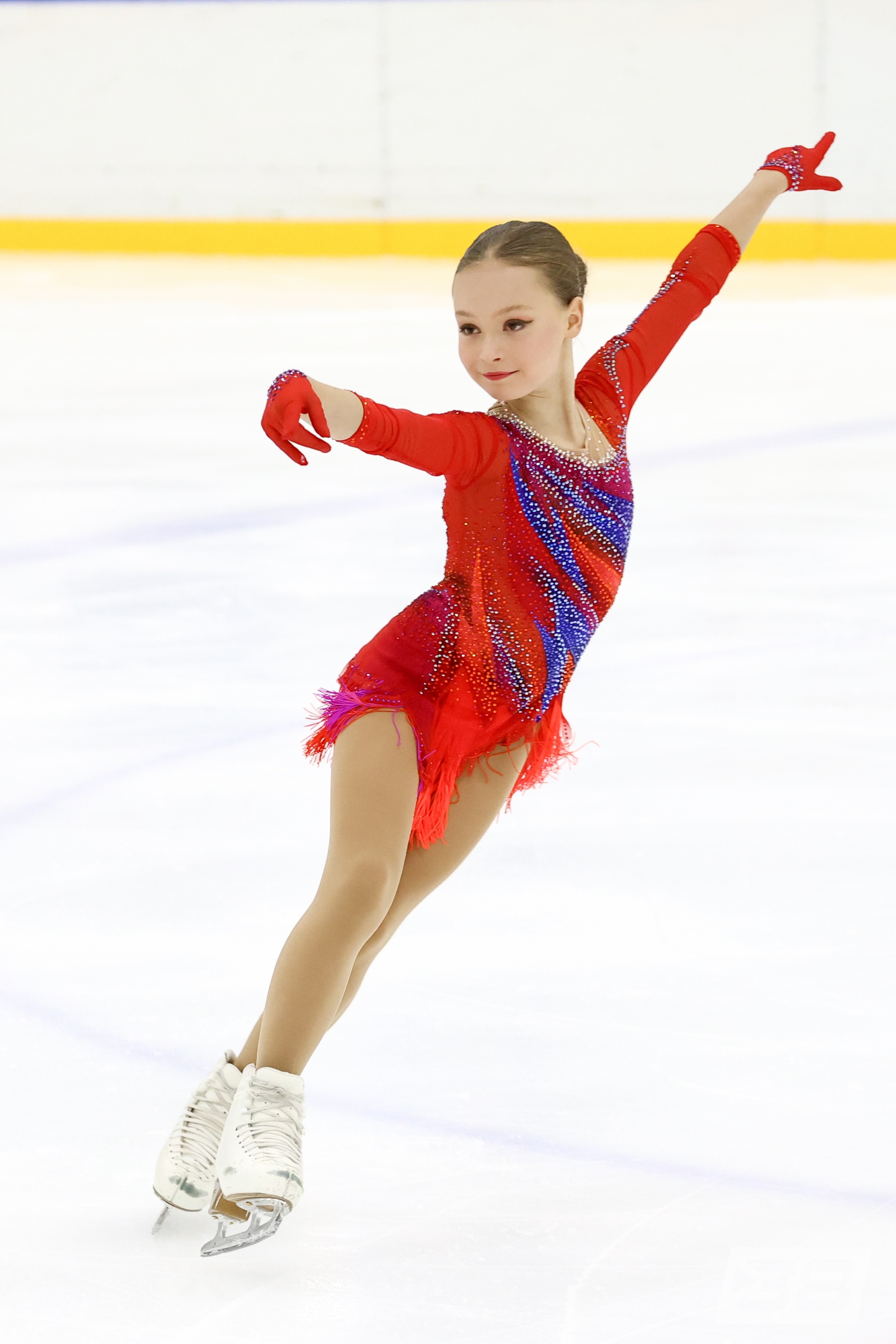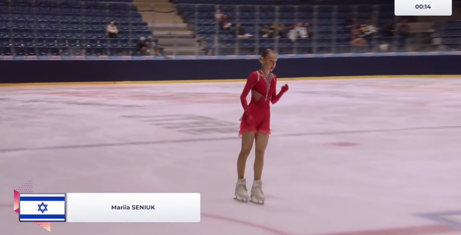 Алёна Витальевна Пяткина, СШ ОГАУ "Кристалл", Южно-Сахалинск в красном сарафане выдыхает у борта перед стартом 3r русская-народная дорожка 3sq2t танцует на зубчиках 2a fall с бести
