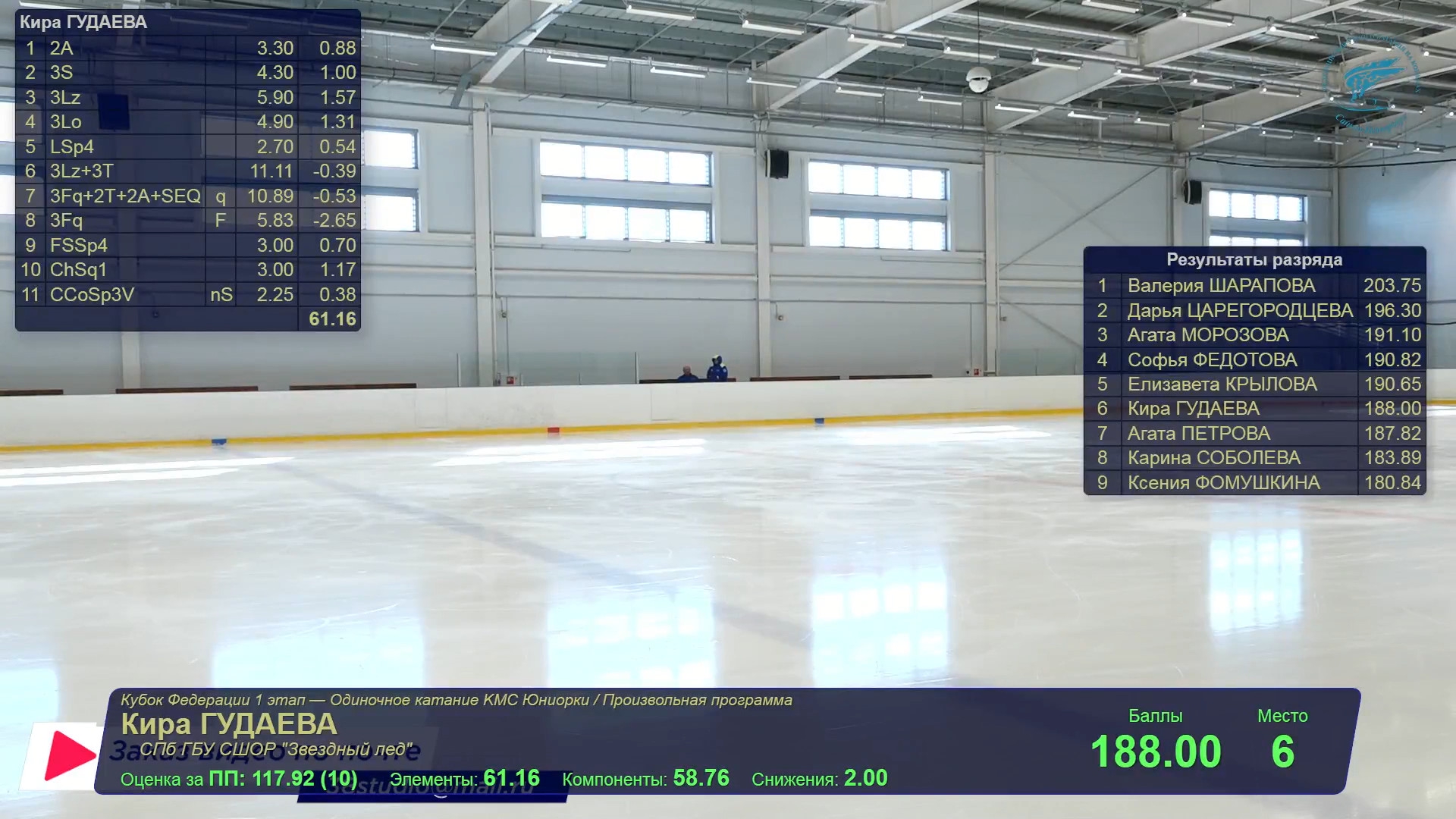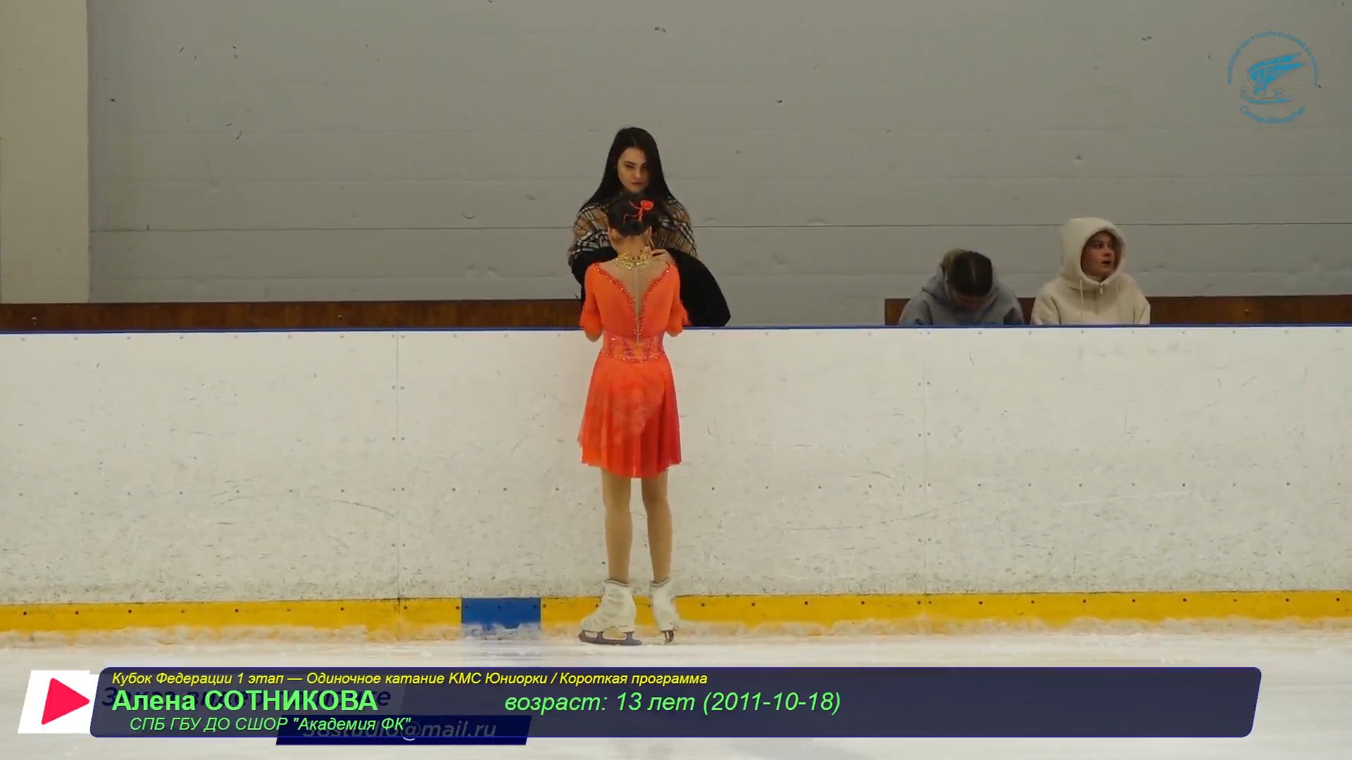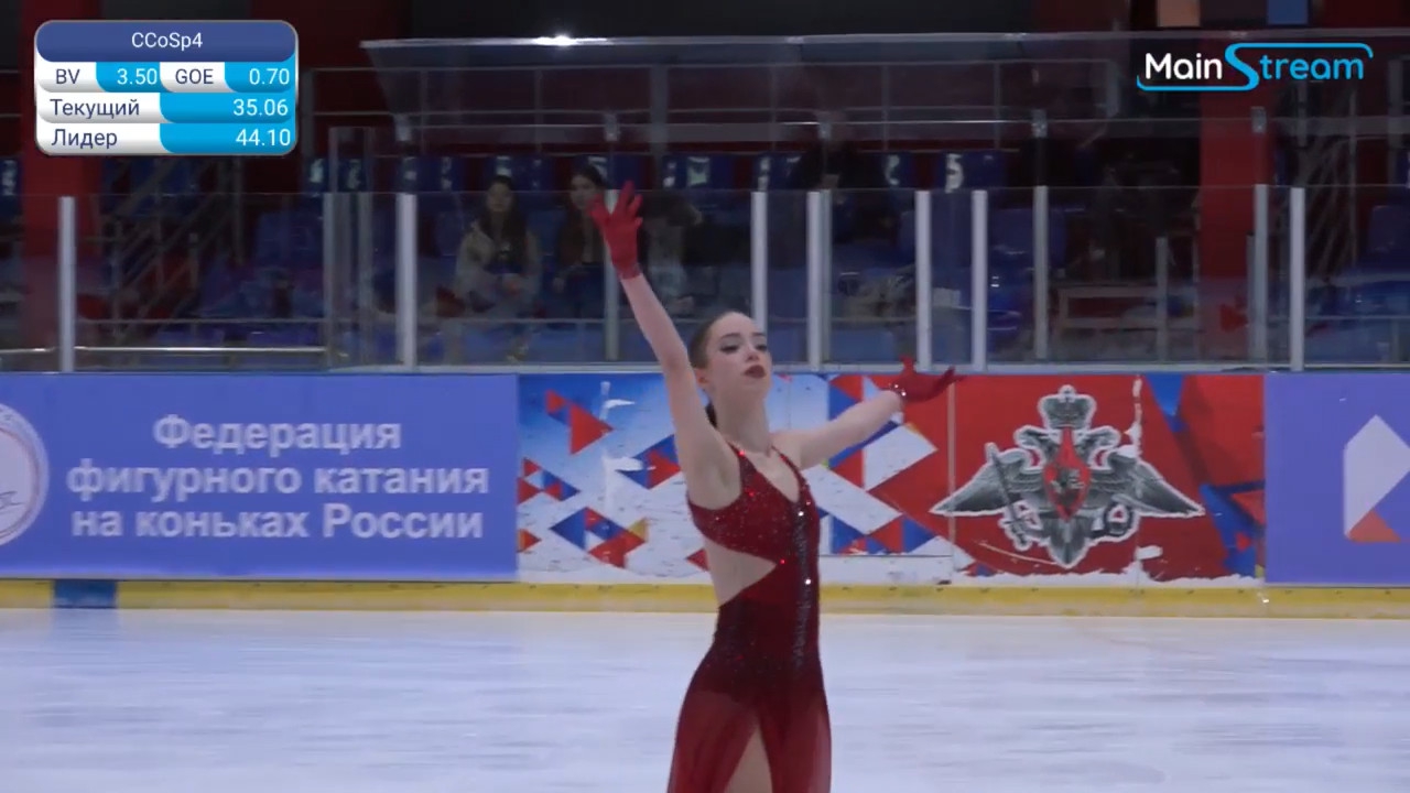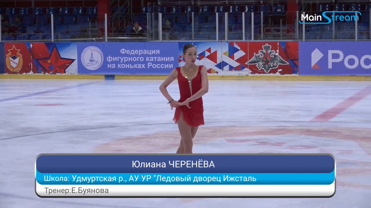 Юлиана Александровна ЧЕРЕНЁВА Удмуртская р., АУ УР "Ледовый дворец Ижсталь на лёд выбежала Значкова, её позвали назад >минуту, наверное >сколько прошло? >спортсмен отсутствует >на лёд приглашается: Полина Артемовна ЗНАЧКОВА г.Москва, ГБУ ДО МАФК школа Хрустальный 3t 3s с гидроблейда, клюнула 3f 3r fccosp с грибочком-комочком chsq1 отжигает 3z!?2a2a 3f<2t 3z2t кувыркнулась в финальную позу, из которой стреляет