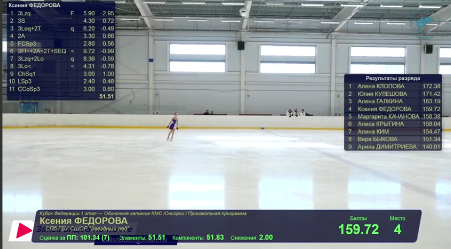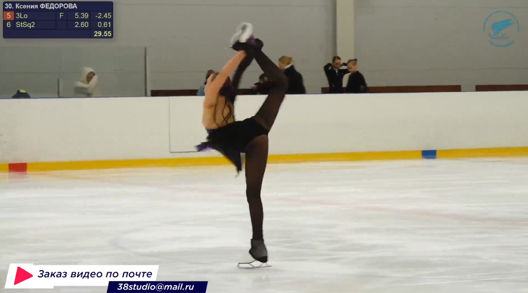 Ксения Алексеевна ФАДЕЕВА Московская обл., МАУ ДО СШОР им.Ю.Е. Ляпкина начинает у борта 3z<3t 2a ну и группировка у неё (отсутствует) 3f на 2 ногу so 3s chsq1 разворот в слайде 3r<2t с шарлотты 3z< эталонный лутцбергер 2a<2t 3r q-шки сами везде расставите