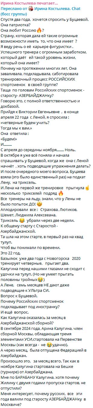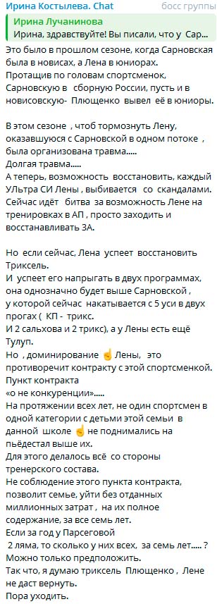 >«Ждём тройной аксель в КП и ПП на первом этапе Гран-При. Но работа по восстановлению пока не начиналась... >Два дубля с намоткой в конце второго часа тренировки — это не работа по восстановлению трикселя. Форы в три с половиной месяца после травмы Лены для Софии Сарновской, наверное, недостаточно? Пункт в контракте «о неконкуренции» данной спортсменки, и ничего личного. >Евгений Плющенко хочет оставить Лену без трикселя в карьере? Лена не согласилась прыгать 3А после 20 четверных на забитые ноги. Лена не хочет падать на больной сустав. Лена знает, что прыжки учат и восстанавливают на «лёгкие» ноги. >Это начало тренировки после распрыжки. И нет смысла сдохшей, с осевшими ногами после 20 четверных, идти на новый прыжок. Она умнеет. Травмы учат. Надеюсь, йогурт она больше не принесёт. >Тулуп — это хорошо. Но прыжки учат и восстанавливают параллельно. Тем более Лена потеряла время из-за травмы. >Здесь Плющенко, как и в прошлом сезоне, принципиально не хочет дать Лене козырь в руки — три ультра-си в двух программах. Триксель — это единственный прыжок, который можно прыгнуть три раза в двух программах. >Какое место на пьедестале заняла бы Лена на ЧР и ФГП, если бы не прыгнула три трикселя? Никакое... Пролетела бы, как фанера над Парижем. >Если работа над трикселем не начнётся с понедельника, идём искать возможность тренировать этот прыжок в другом месте». >*текст отредактирован на предмет ошибок >Cr: соцсети Ирины Костылевой Мам Ира крутит Рудковскими как хочет. Пока не исполнят ее желание, будет их говном поливать.