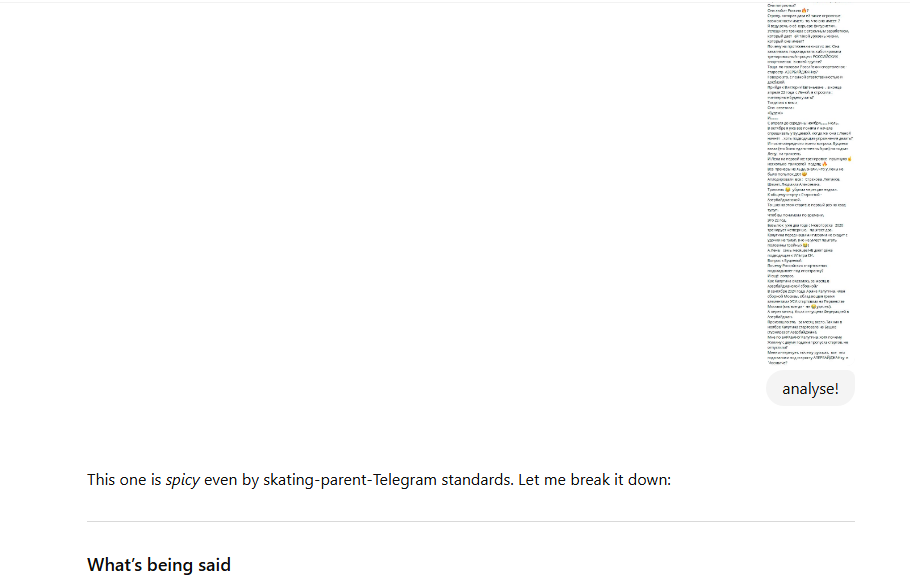 Предыдущий: >>3241624 (OP) Источники, не особо заслуживающие доверия, но всё же, сообщают что: такое впечатление, что в Екб появился лед. А тренеры по прыжкам не появились. Парницы до последнего времени имели общие раздевалки с парнями. У них отсутствуют, поэтому, естественные стыд и скромность, которые просто изнечтожают. Кто-то тут ещё в курсе за Touhou. Виктория Титова собирала игрушки на этапах Битвы школ в прошлом сезоне. Очень боевая. Тяжёлые психические расстройства итт прогрессируют. Сгонял на Лидии Зверевой под дождем. Бершадская оставила свою пиратскую ПП за что получила пиратского медведя. Не сказать, что Корчажникова в Хрустале как-то ухудшилась, но и чемпионские программы ей не ставят. Не нужна она там, как и Андреева. Вероника Ольхова уверенно залидировала, вопли на трибуне. Что Бородина из Ижевска делает на региональных соревнованиях? Прыжки как у Брагиной. Вряд ли это Ижевск. Полина БЕРШАДСКАЯ просто бриллиант. Сейчас из Бершадской делают хорошую фигуристку вместо перформерши. Но прыжком она никогда не отличалась. Мамку автора песенки Огоньковой звали Мария Амплеевна Улыбина. Родственница? Валерия Федотова изображает ОЧ. Ну хоть кто-то. Попцова с Клениной. Пьет кофе и фотографирует судей не на телефон. Шустрая. Прыгает флип не в углу (как С.Захарова). Ломатели все поломали. Бершадская вылазит по канату из кантилевера и вроде бы стреляет в каскаде (сложно понять). Нет, всё-таки не стреляет. Во всяком случае, не в судей. Калугина - степаут на 4s, вроде докручен. Может, Калугину тоже к Орсеру? Китайцы соблюдают шаббат. За планами - к Мозер. Нахаева проиграла Мышкиной. Галиной Владимировной была вскрыта тема ассиста второй ногой на сальхове. Думал что Безсилко зовут Бесилко. Очень концептуальный костюм у Марковой. Свидерская с мехом на плече. Александра Андреевна ОЛЕНИНА с Ямайкой. Триумф Василисы Щербаковой. В Сочах Рейнольдс (из большой вроде бы федры) с 6 неупаденными ультрасями (+2 упаденных и 0 бабочек) набрал меньше накосячившей Сотниковой с 0. На новом фсо, например, пишут, что М.Захарова медленная. Но увидеть это в трансе неЮлы затруднительно. Lena utterly corrupted by Plushe. Проболел какой-то китайской заразой и проспал возвращение Ципухиной. ЛА КРК "Нагорный" каток близнец Казанского, оба построены в 1965-66.