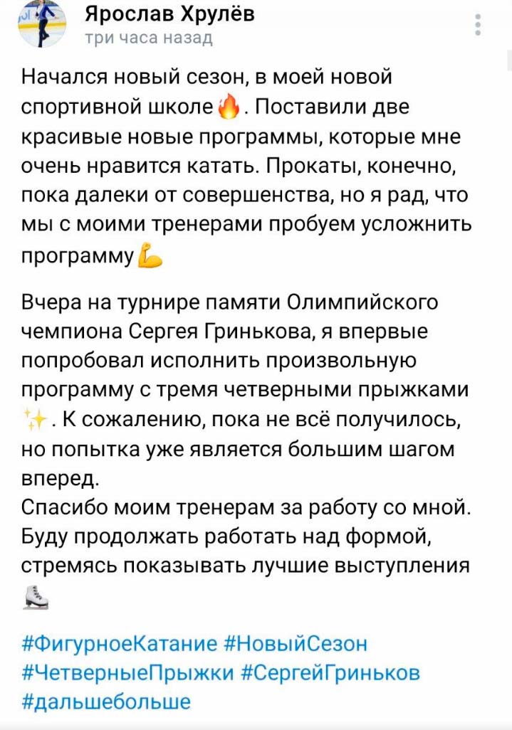 >>3243859 >Самсонов — о переходе к Соколовской от Тутберидзе: «Что изменилось в новой группе? Другой тренировочный процесс, непривычный, в первую очередь, для меня – эффективный. В плане эффективности стал делать меньше бабочек, это дает повод радоваться, что сделал правильный шаг, с каждым месяцем я должен улучшаться» Улучшения заметны. Продолжай