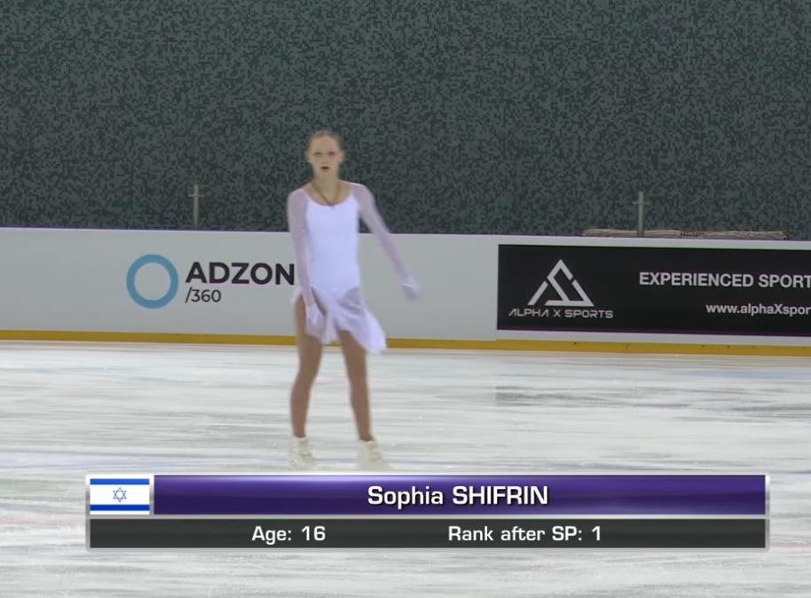 София Шифрина, 16 лет, чемпионка страны по юниорам начинает от борта 3z3t 2a с кораблика показывает в судей пальцами, в дрыг 3r в твизлы обязательный прыжок в грибочек-комочек stsq3 с противоположным бортом